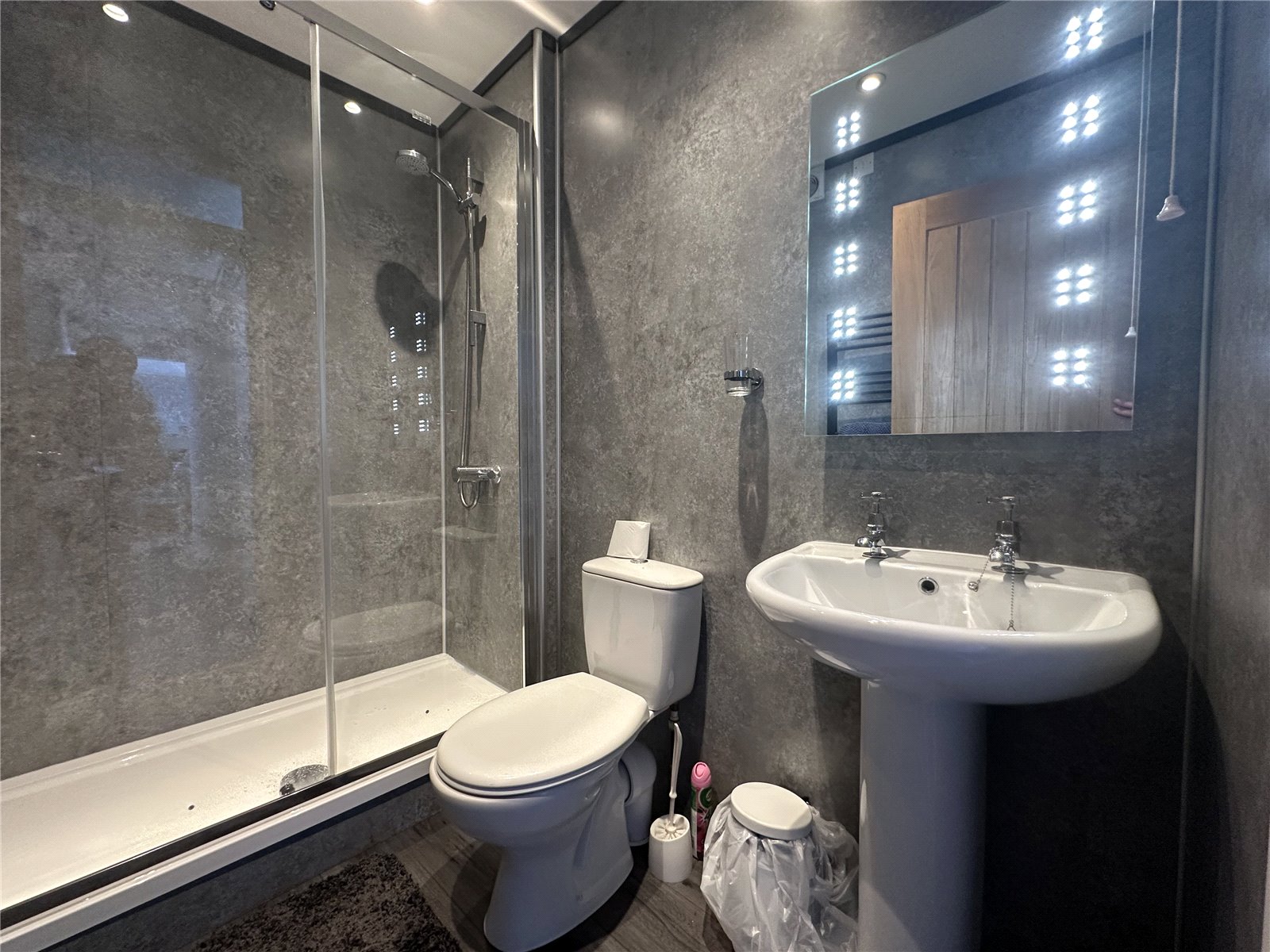 Recently Modernised Shower Room, Sink, WC, Towel Rail, Glass Shower Screen, Grey Laminated Flooring