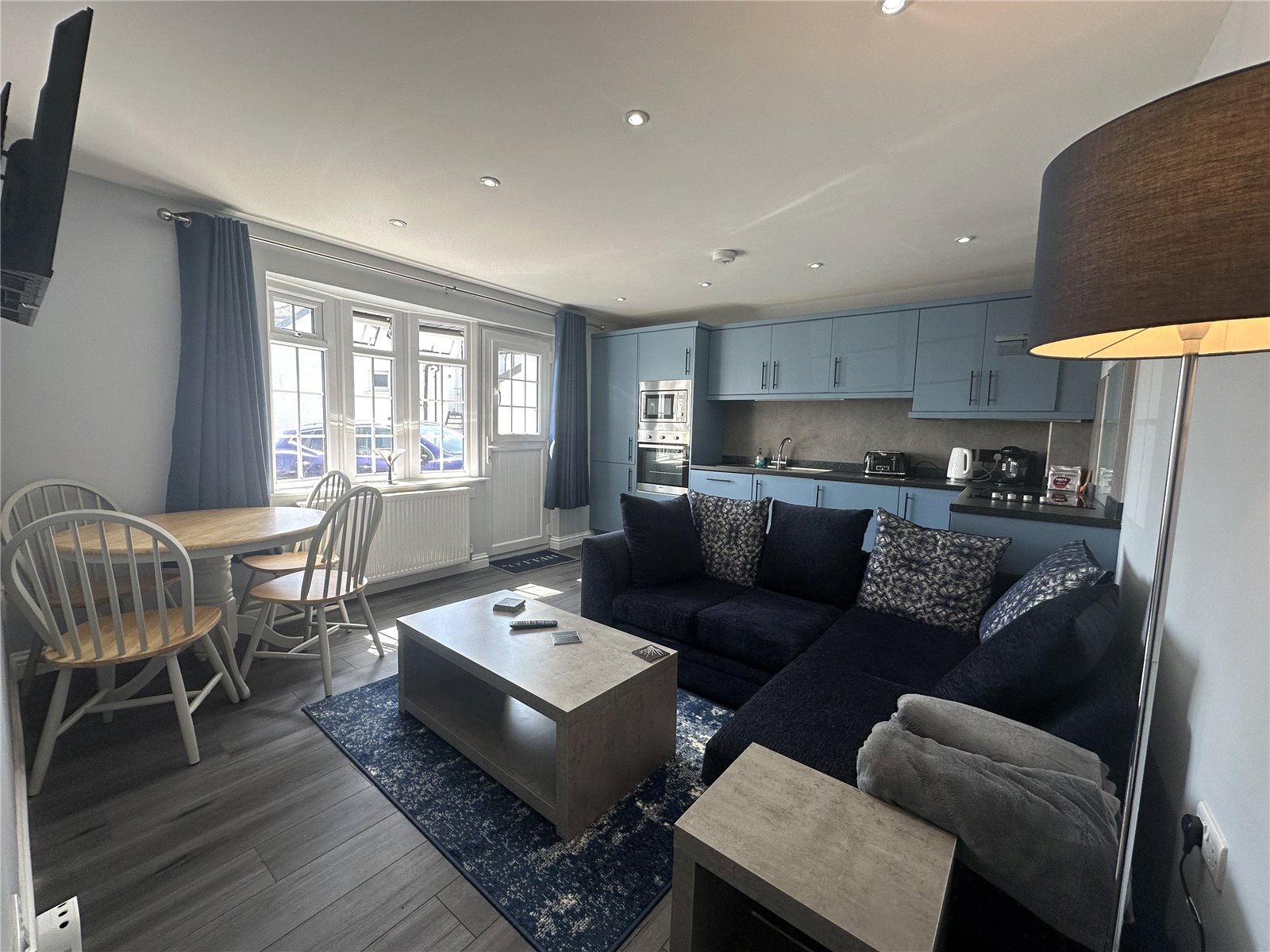 Base & Wall Mounted Units, Integrated Appliances, Sink, Grey Laminate Flooring, Bay Window, Radiator, Upvc Stable Style Door