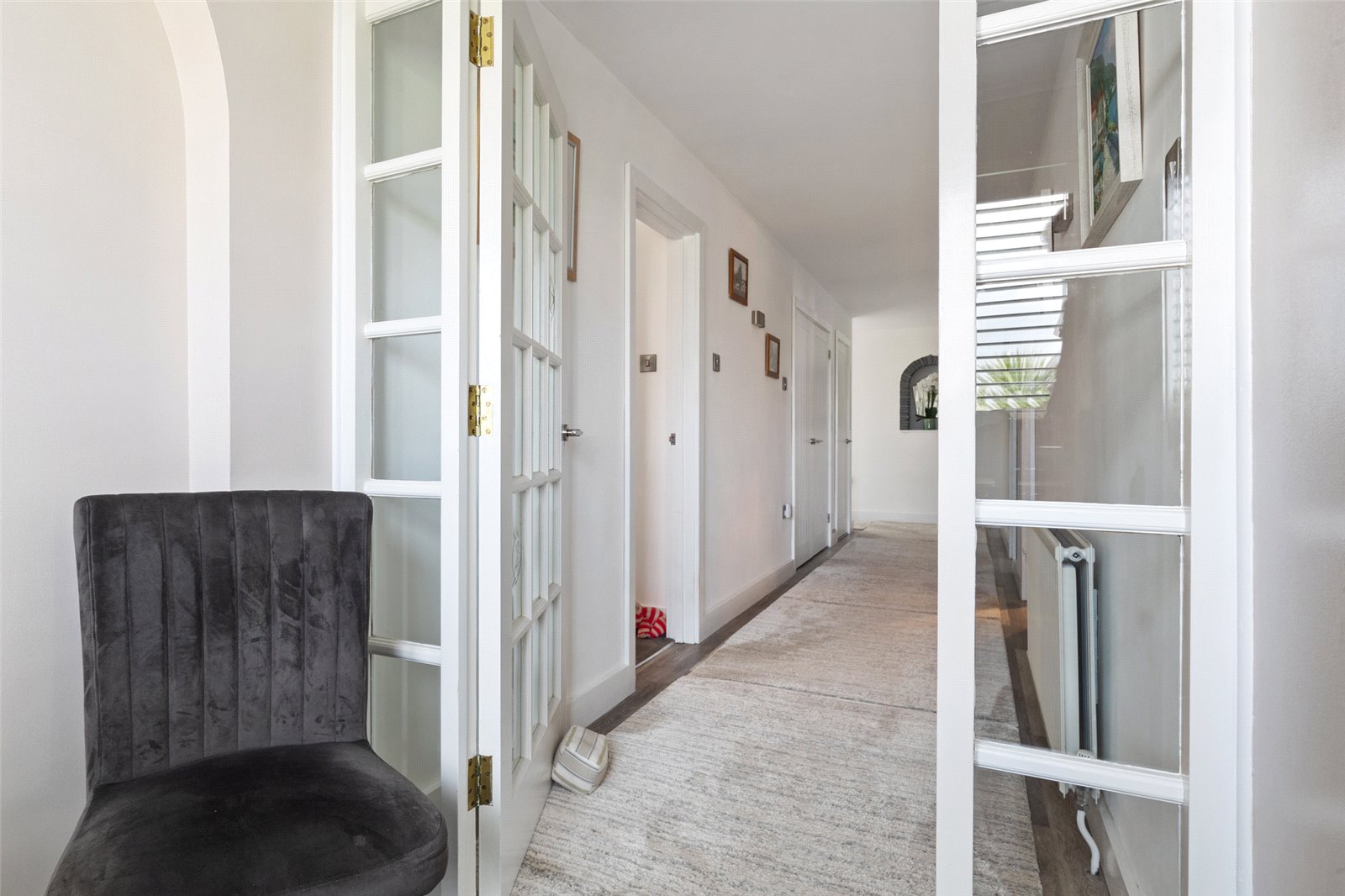Karndean flooring, radiator, double doors to study, storage cupboard, radiator.