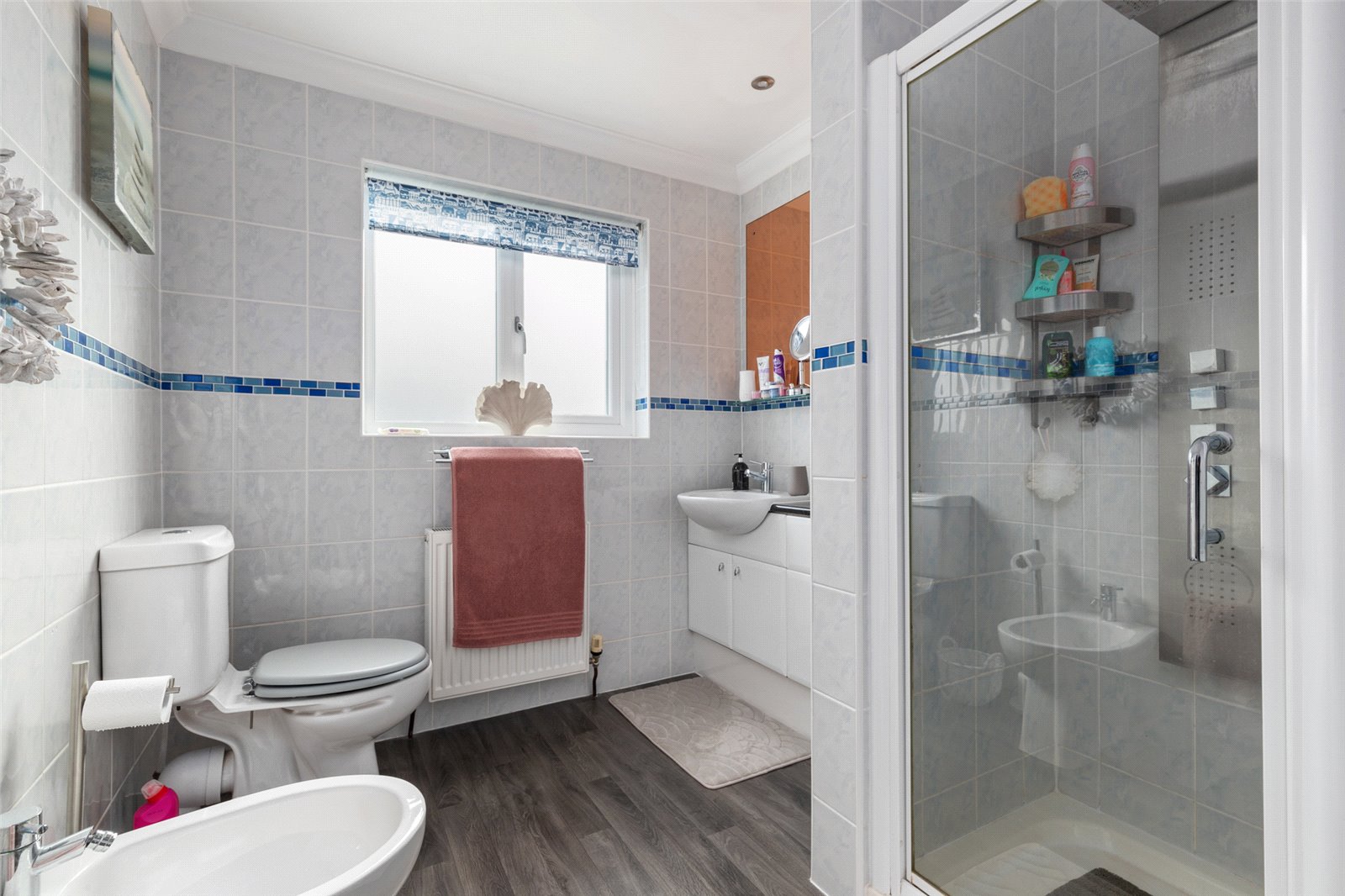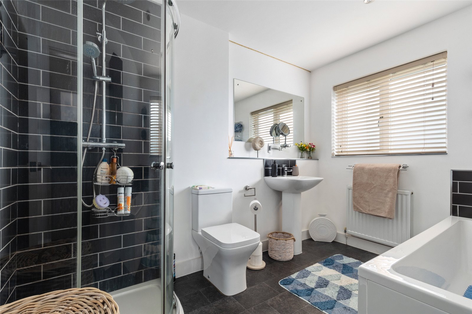 vinyl floor, shower, WC, wash hand basin, bath, radiator, double glazed uPVC window to side.