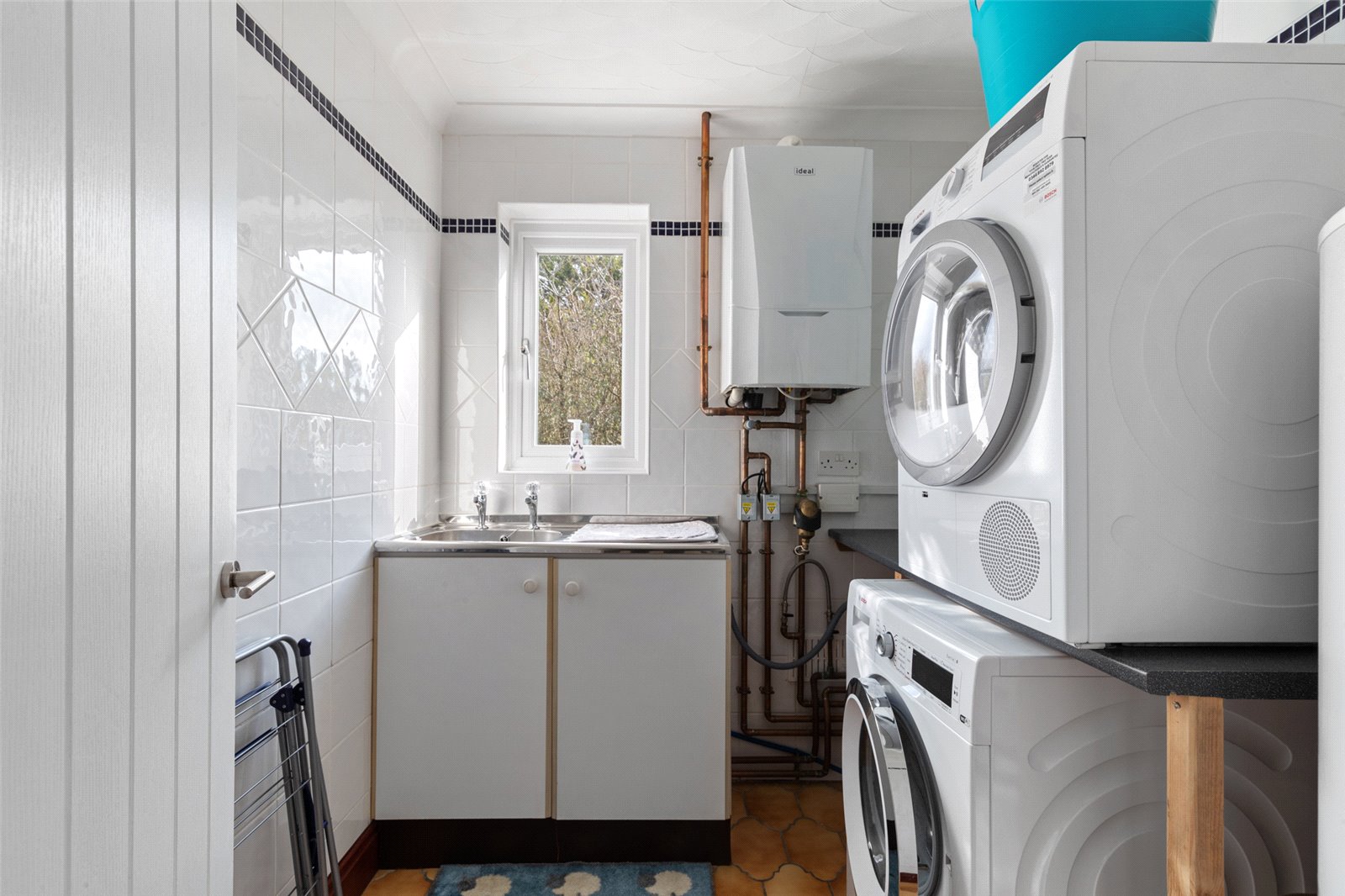 Tiled flooring, base units with sink and drainer, boiler and hot water cylinder, space for washing machine and tumble dryer, double glazed uPVC window to side.