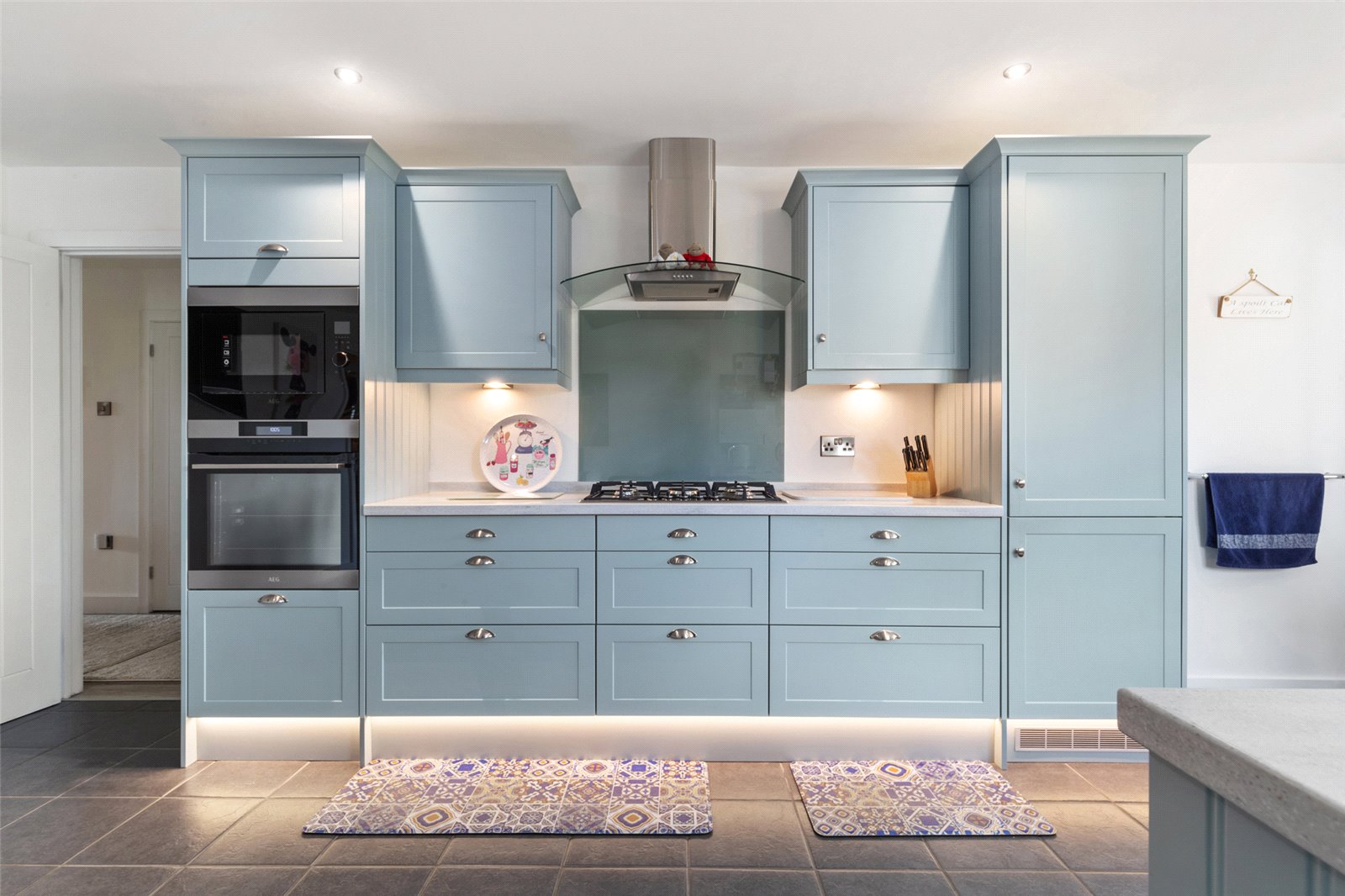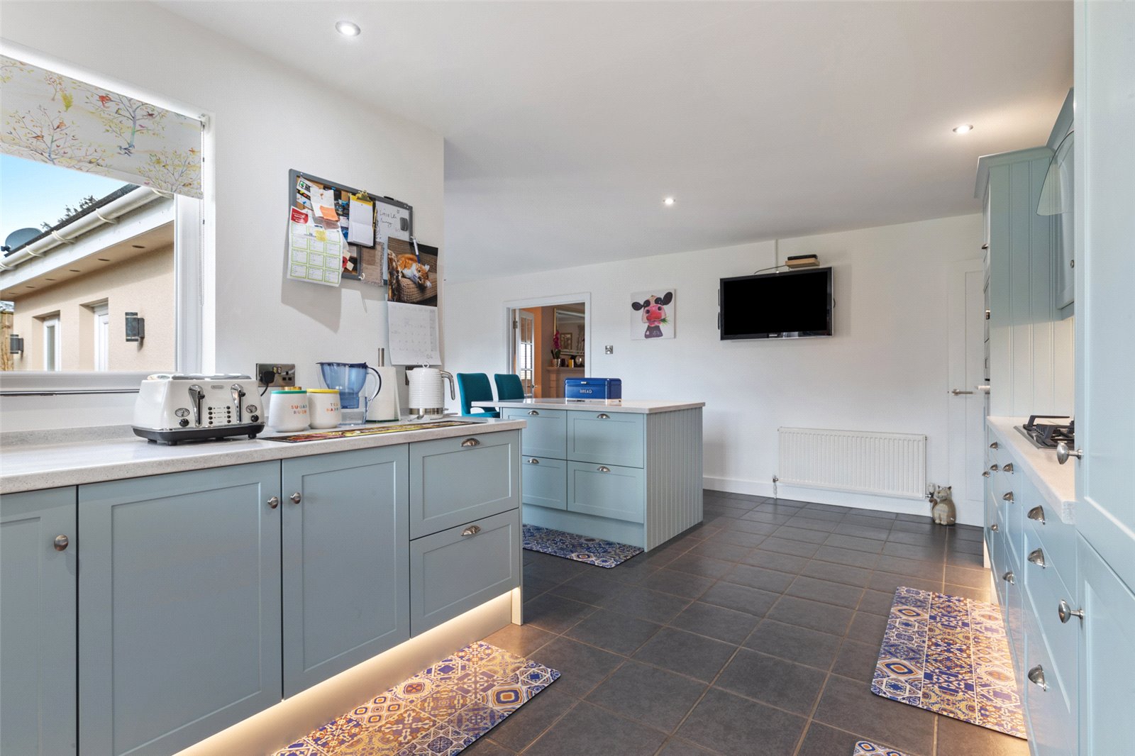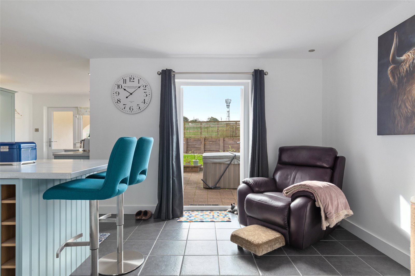 Tiled flooring, recently fitted kitchen units, range of base and wall mounted units with island breakfast bar, built in microwave, oven, fridge freezer and 5 ring hob, sink, radiator, double glazed uPVC window to side and rear, double glazed uPVC door to rear, double glazed uPVC double doors to rear.