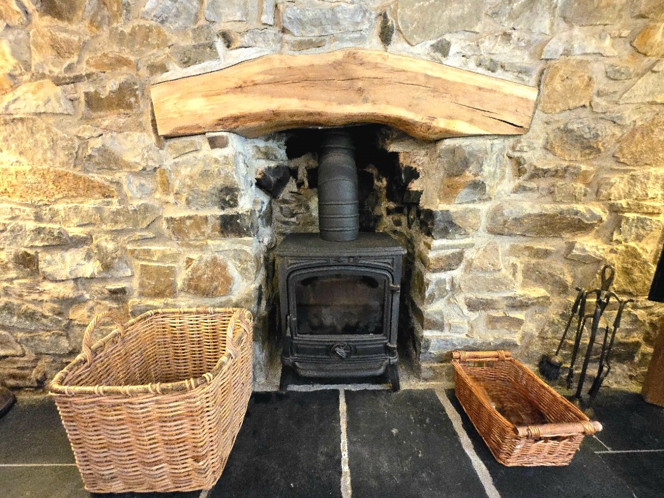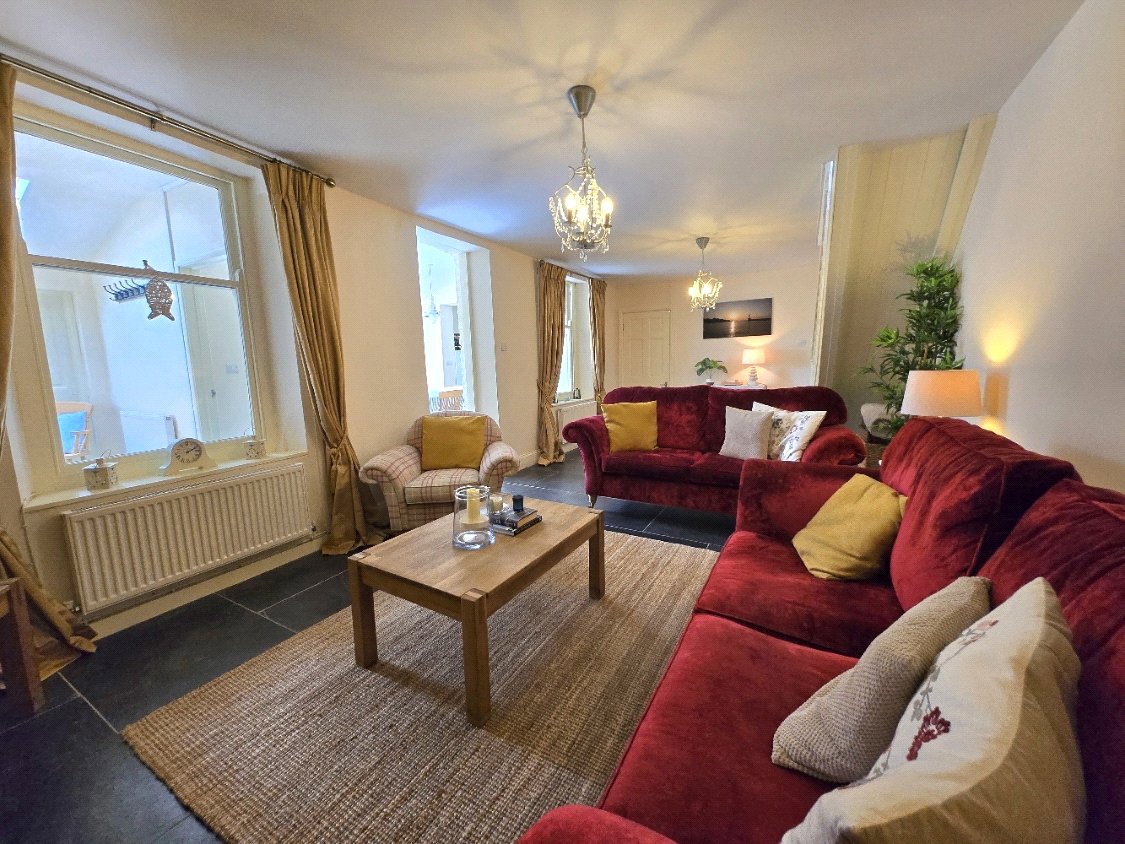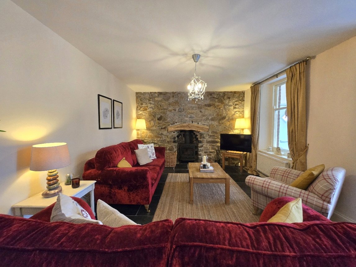 his impressive, living room in Haverfordwest seamlessly blends historic charm with contemporary comfort. The durable slate flooring lays a striking foundation, providing a robust yet elegant surface throughout. A captivating focal point is the original stone wall, a testament to the property's heritage, which beautifully frames a rustic log burner set upon a matching slate hearth. An elegant oak mantel sits proudly above.