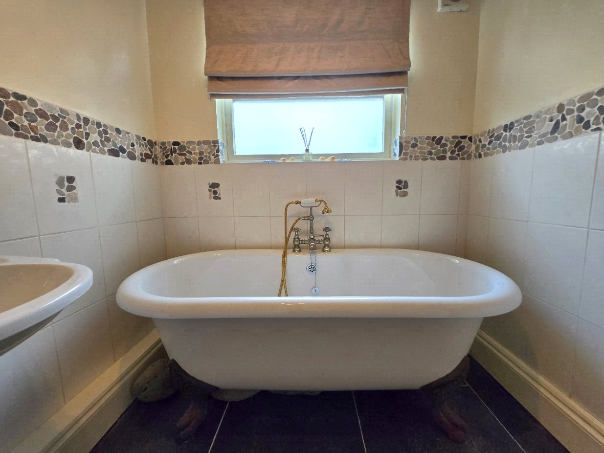 This well-appointed bathroom offers a harmonious blend of style and functionality. The durable slate flooring provides a sophisticated and practical foundation for the space. The walls are elegantly finished with tiles half way up, offering both protection and a clean aesthetic. Natural light enters through an obscure glass window to the rear, ensuring privacy while still allowing for a bright atmosphere.
