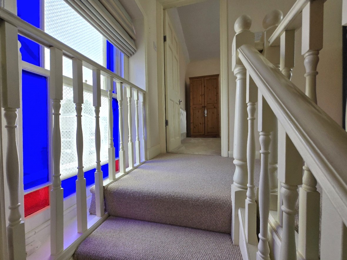 Two generous windows allow ample natural light to stream into the space, offering views to the surrounding area. The room is thoughtfully illuminated by two light fittings, ensuring a warm and inviting ambiance even after dusk. A prominent feature is the stairs leading to a large landing, promising further exploration of the home. This transition is made particularly special by a captivating stained glass window on the landing, casting colourful hues and adding a touch of artistic flair to the heart of the home.