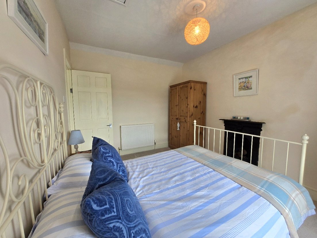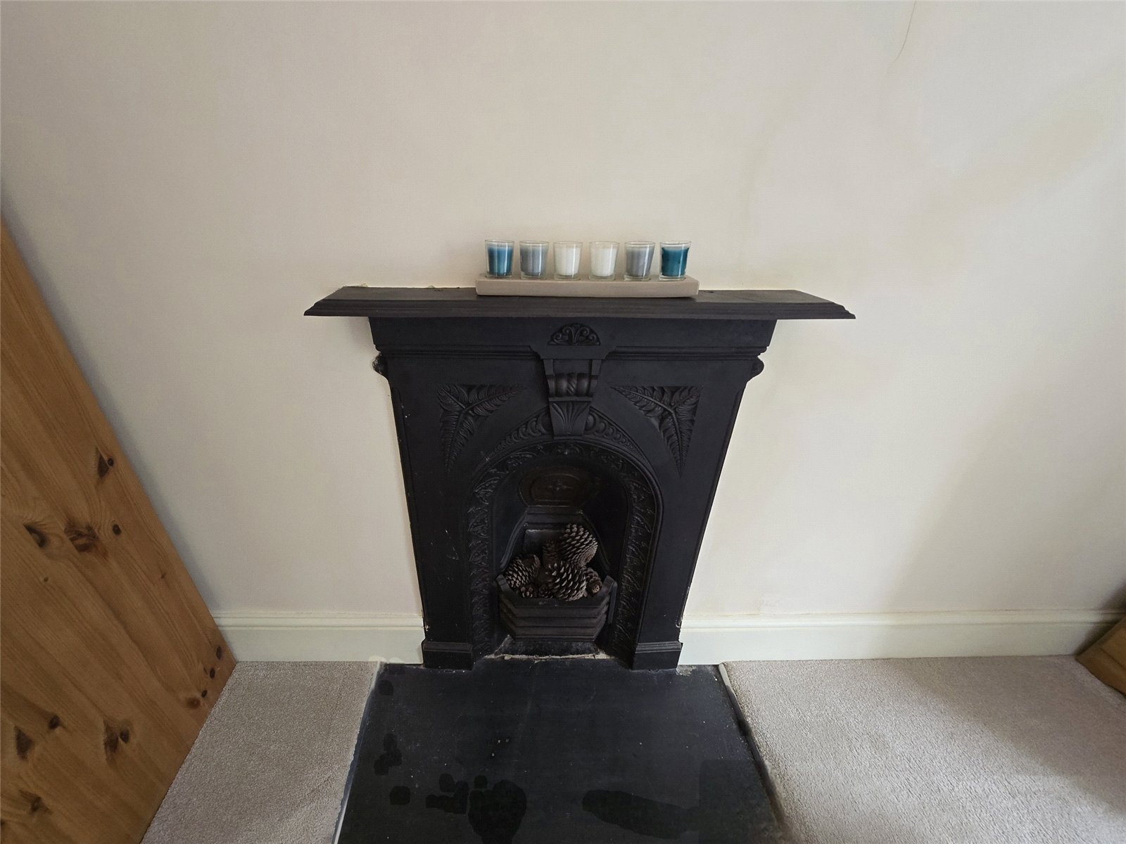 This comfortable double bedroom offers a cozy and inviting atmosphere. The soft carpet flooring provides warmth and comfort underfoot. Natural light streams in through a window to the rear, offering views to the property's garden or surrounding landscape. A charming fireplace serves as a focal point, hinting at character and providing the potential for a warm glow on colder evenings. The room is completed by a central light fitting, ensuring adequate illumination.