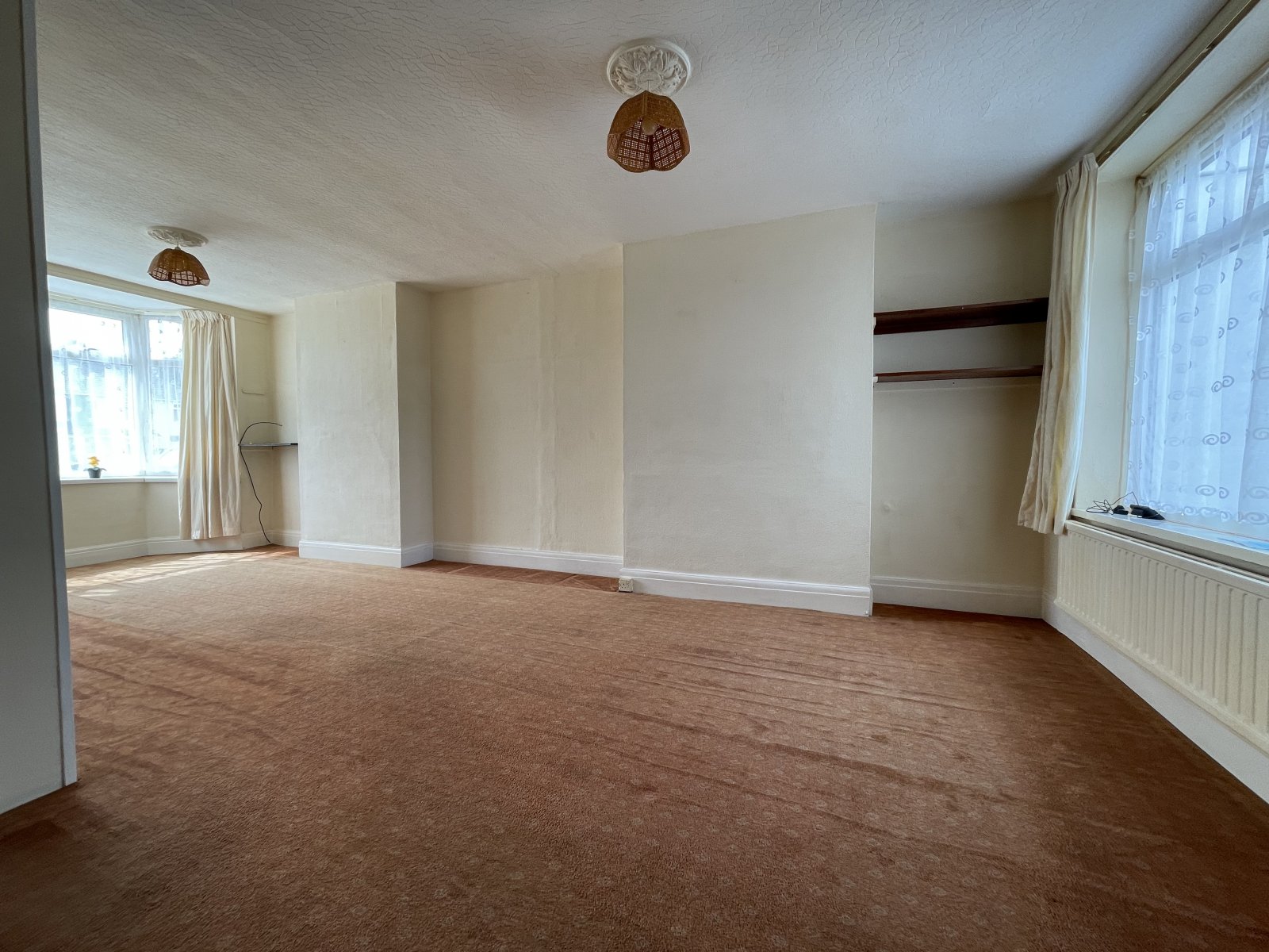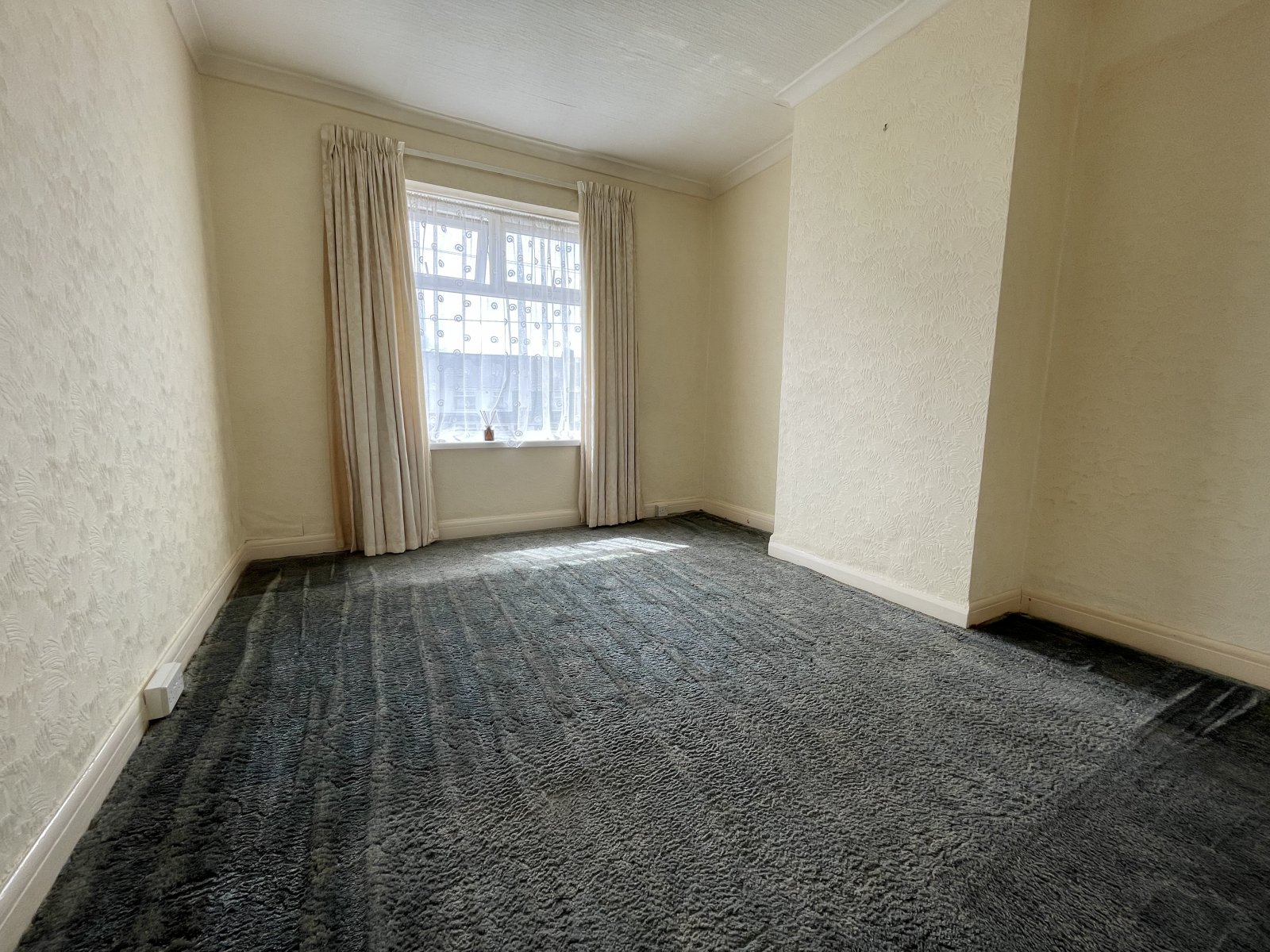 Front-facing double bedroom, with uPVC double-glazed window, carpeted flooring & light fitting.