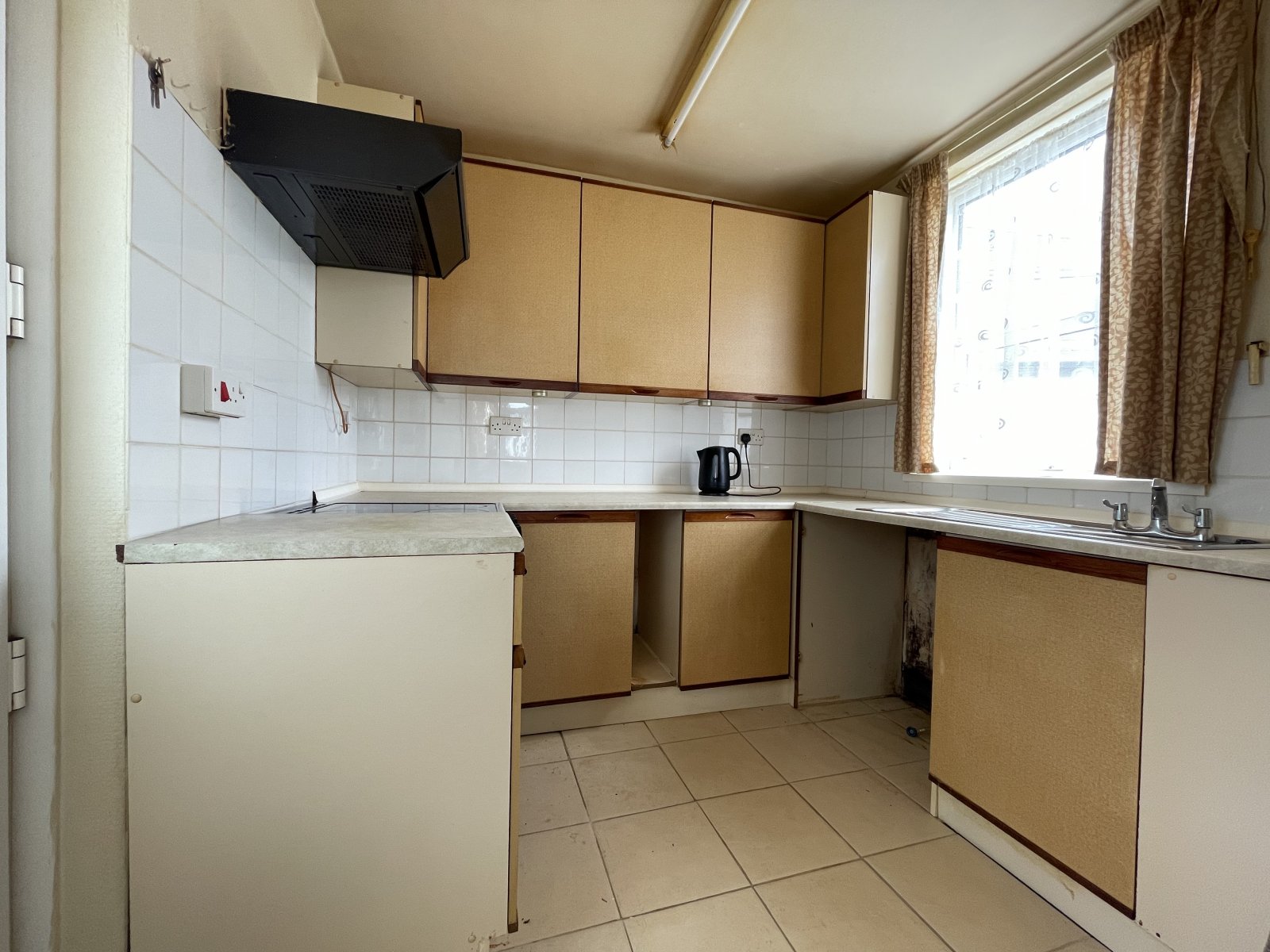 Square kitchen with base & wall units, space & plumbing for white goods, stainless steel sink & drainer with mixer tap, electric oven with extractor over, as well as tiled flooring, uPVC double-glazed window overlooking garden and uPVC double-glazed door access to garden.