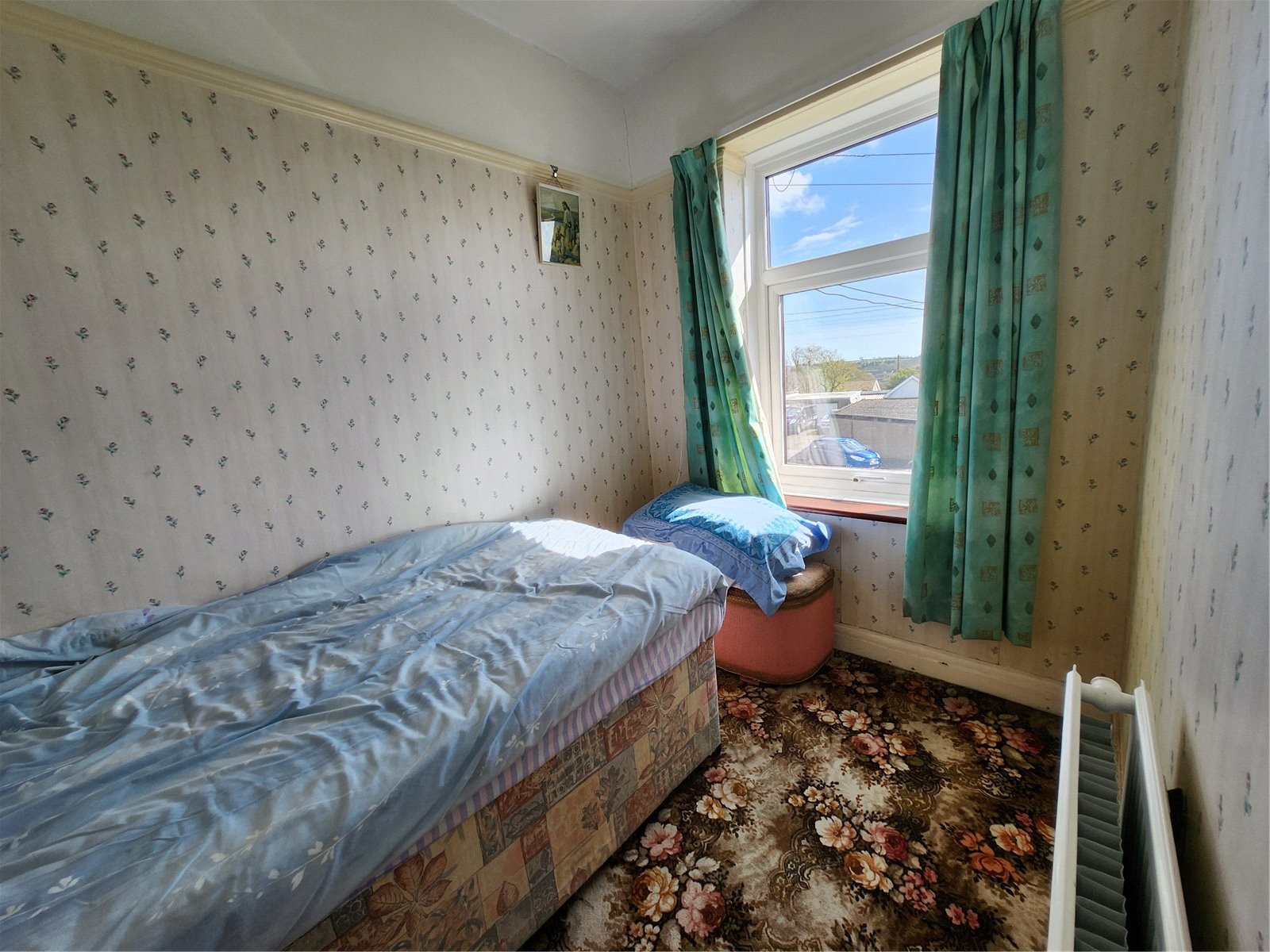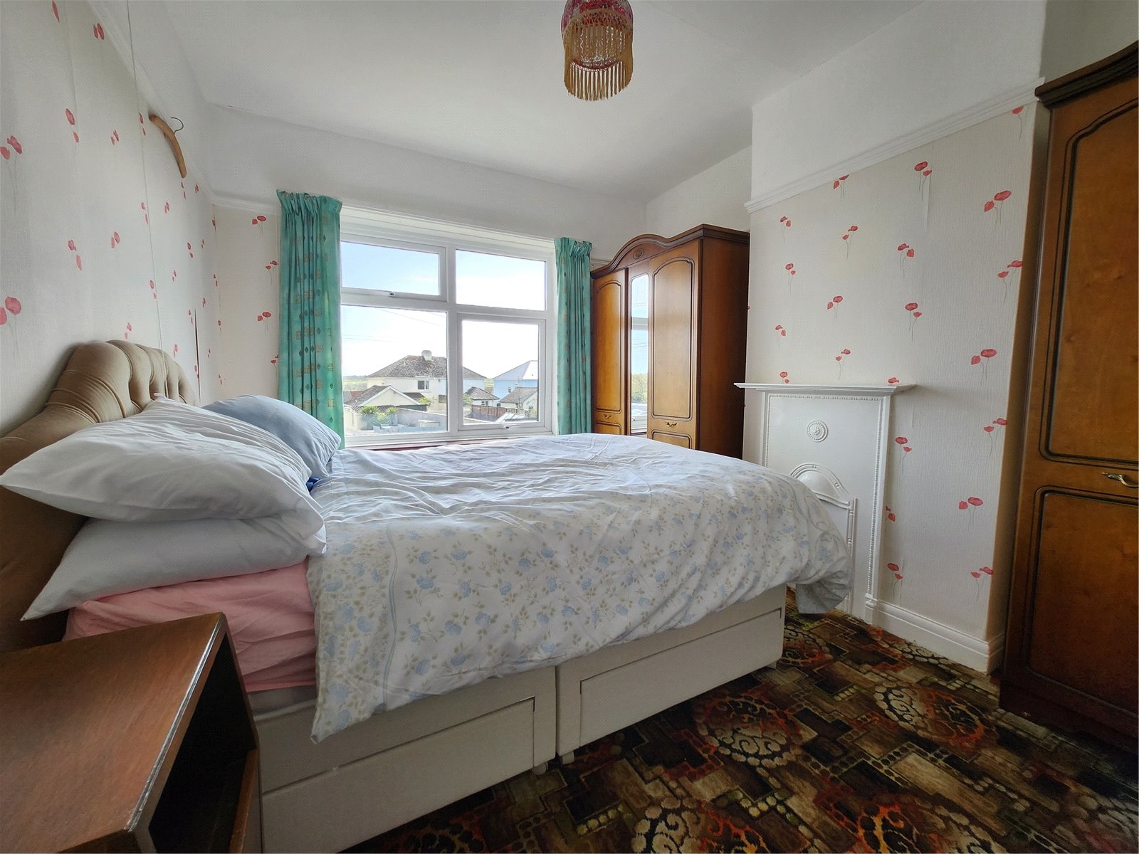 Front-facing bedroom, with uPVC double-glazed window, carpeted flooring & light fitting.