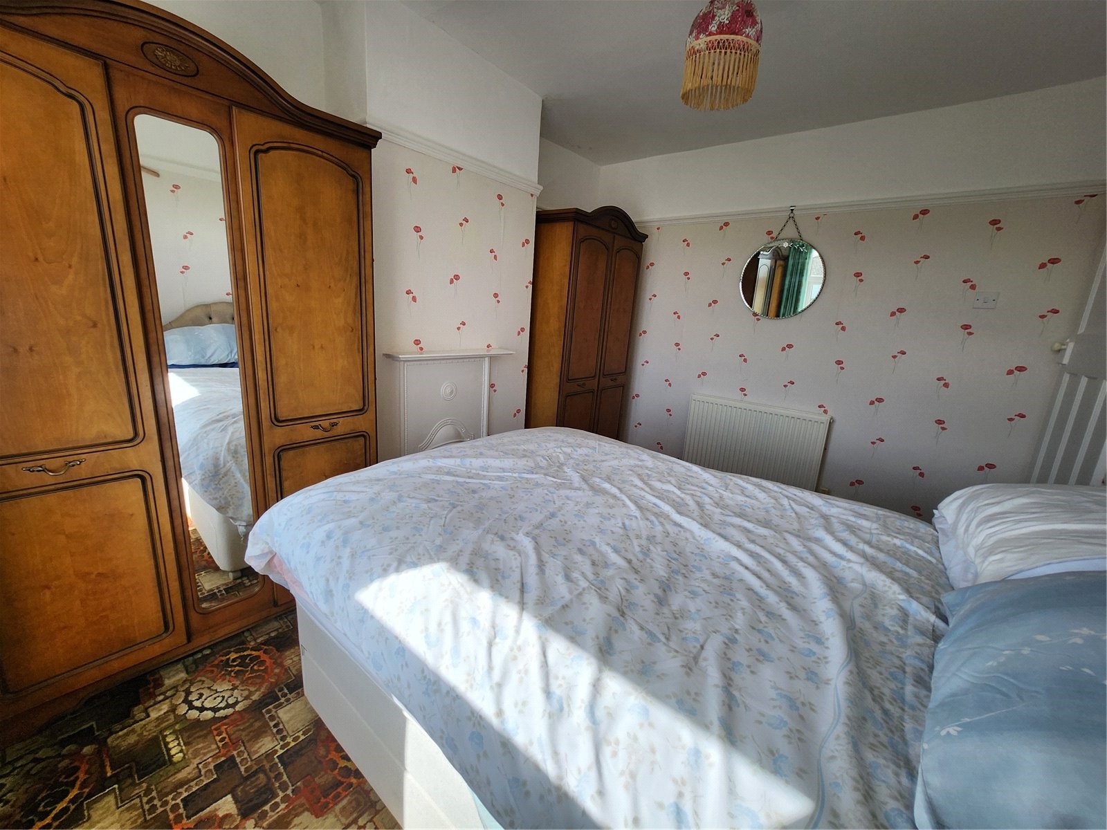 Front-facing double bedroom, with uPVC double-glazed window, carpeted flooring & light fitting.