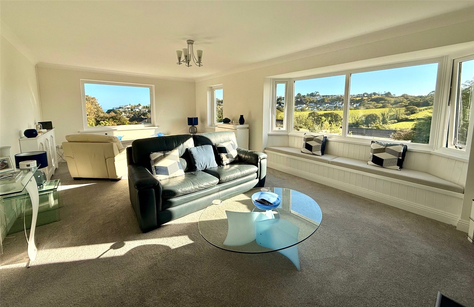 Large dual aspect lounge, Bay window with window seat and countryside views, large picture window with Sea Views. Fire surround with flame effect electric fire. Grey