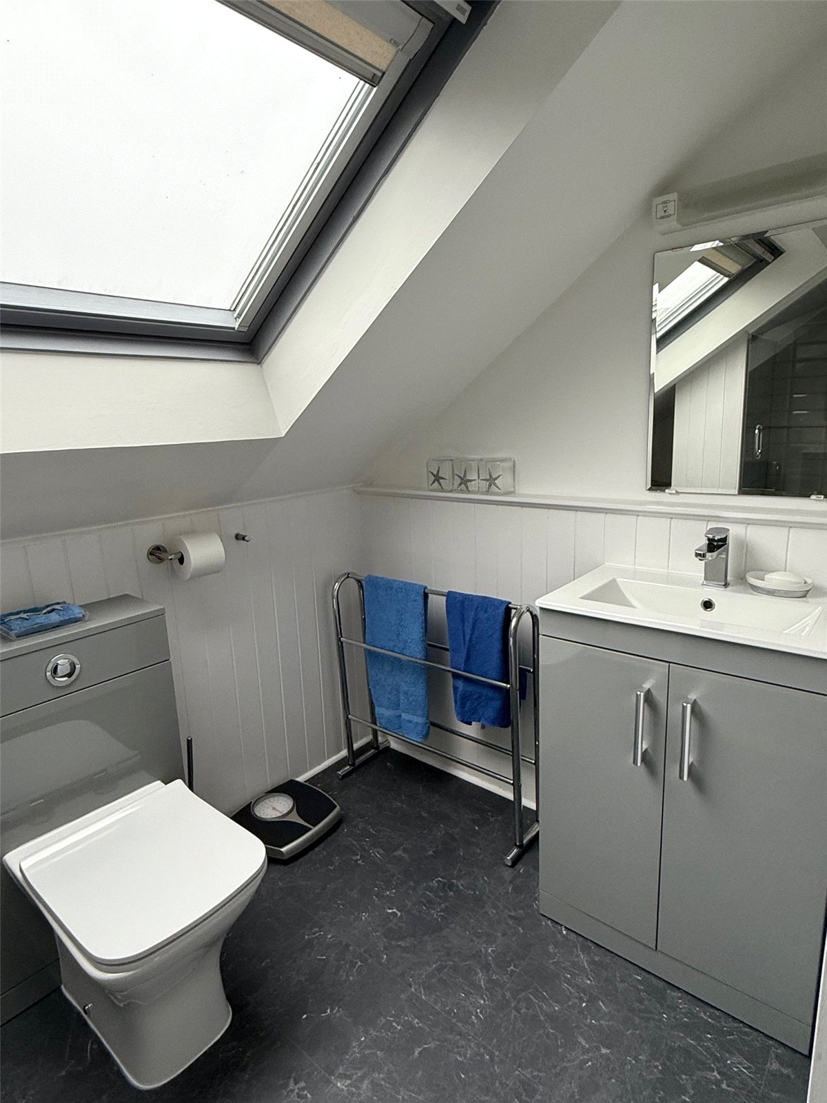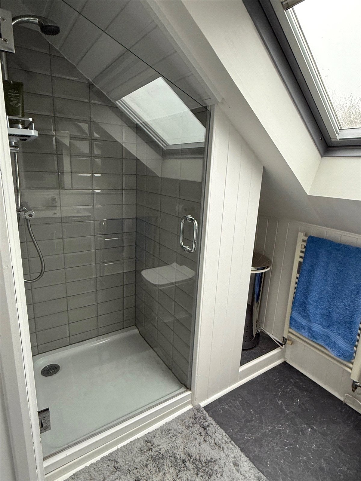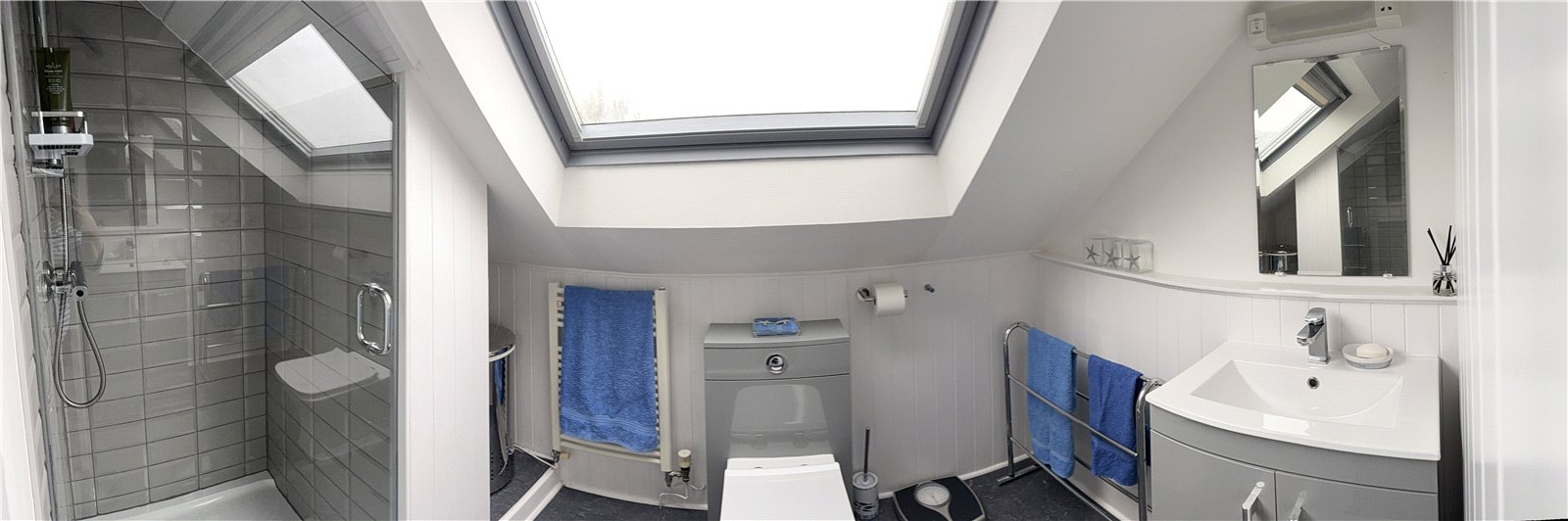 Half panelling, Vanity unit and sink, WC, walk in shower, Glass screen, Towel rail, Velux window, LVT flooring, and sliding door.