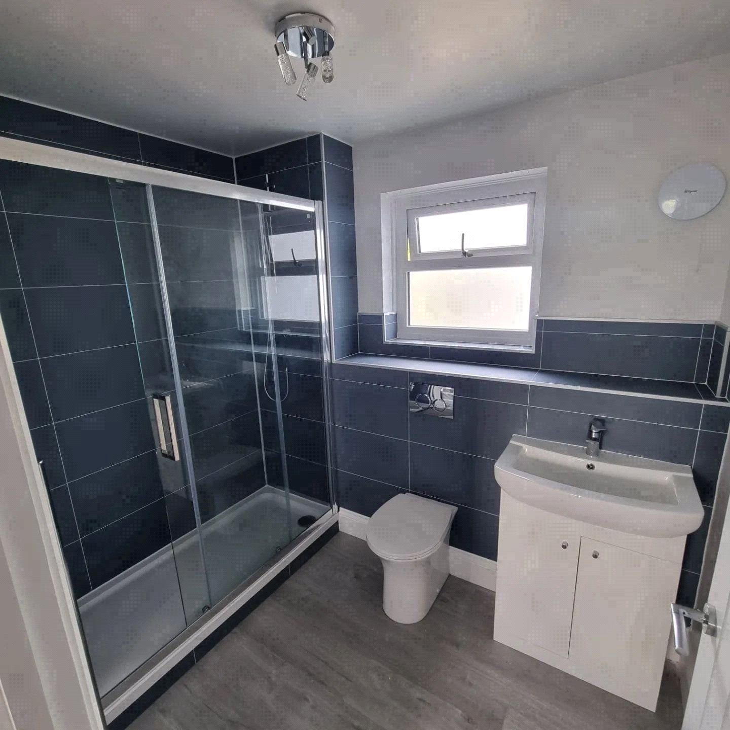 Large Aquadart 8mm glass screen Walk-in shower, Vanity unit and sink, Rimless WC with Geberit Delta Concealed Cistern and Flush Plate. Fibo Tile effect wall panels and Mirror with LED lighting. LVT flooring, Towel rail, Window with obscure glass, extractor fan