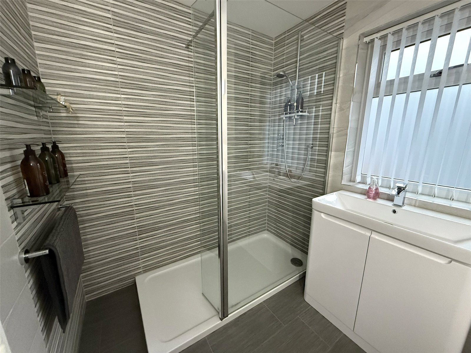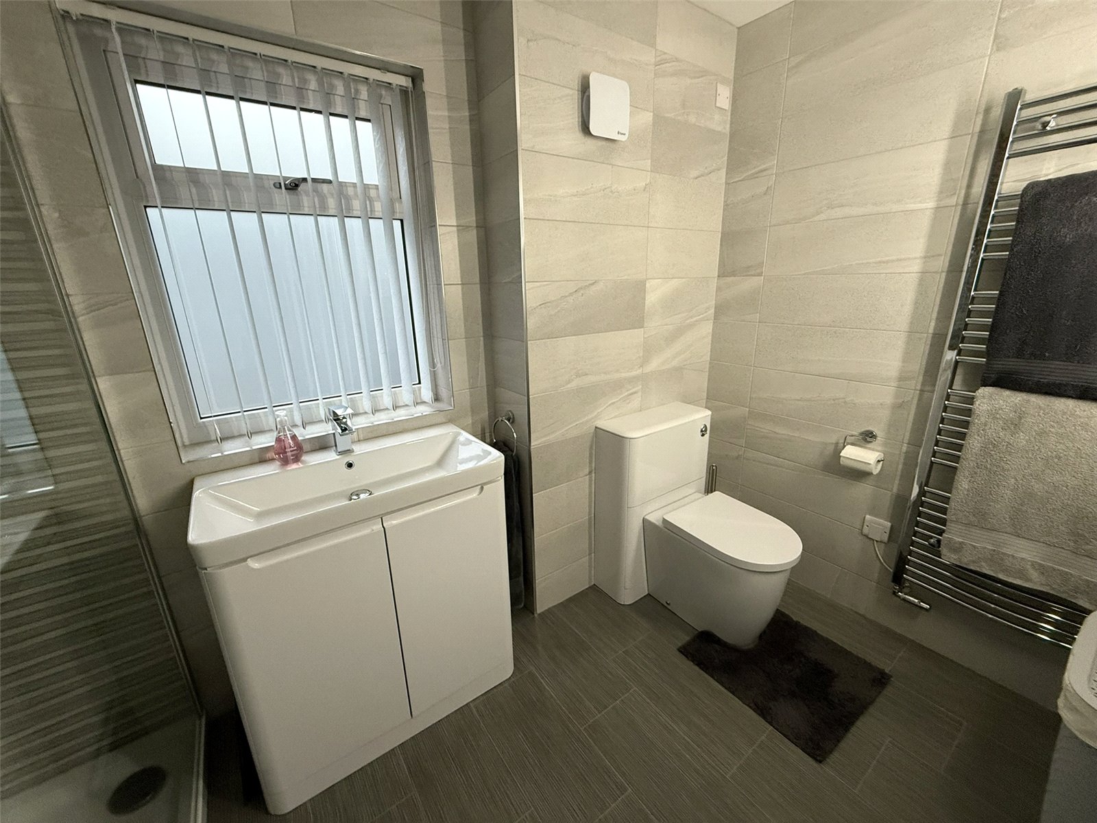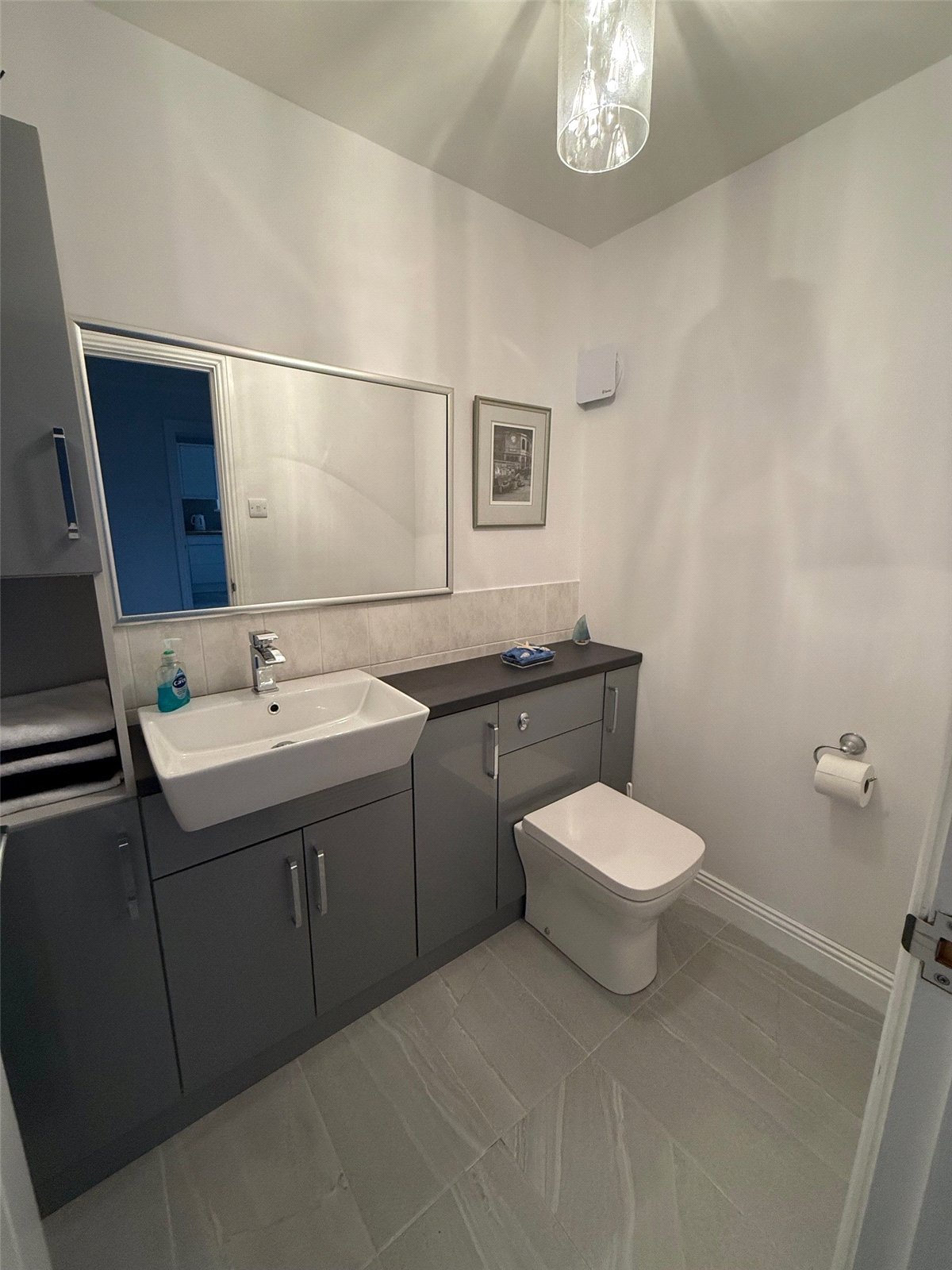 Fitted grey Storage units with vanity unit and sink, tiled splashback, WC, towel rail, extractor fan, Tiled flooring