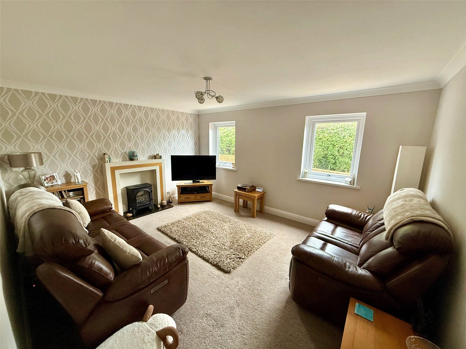 This inviting living room offers a cosy atmosphere, perfect for relaxation. Fire surround, granite hearth with Electric log effect burner, Radiator, Dark beige carpet, Two