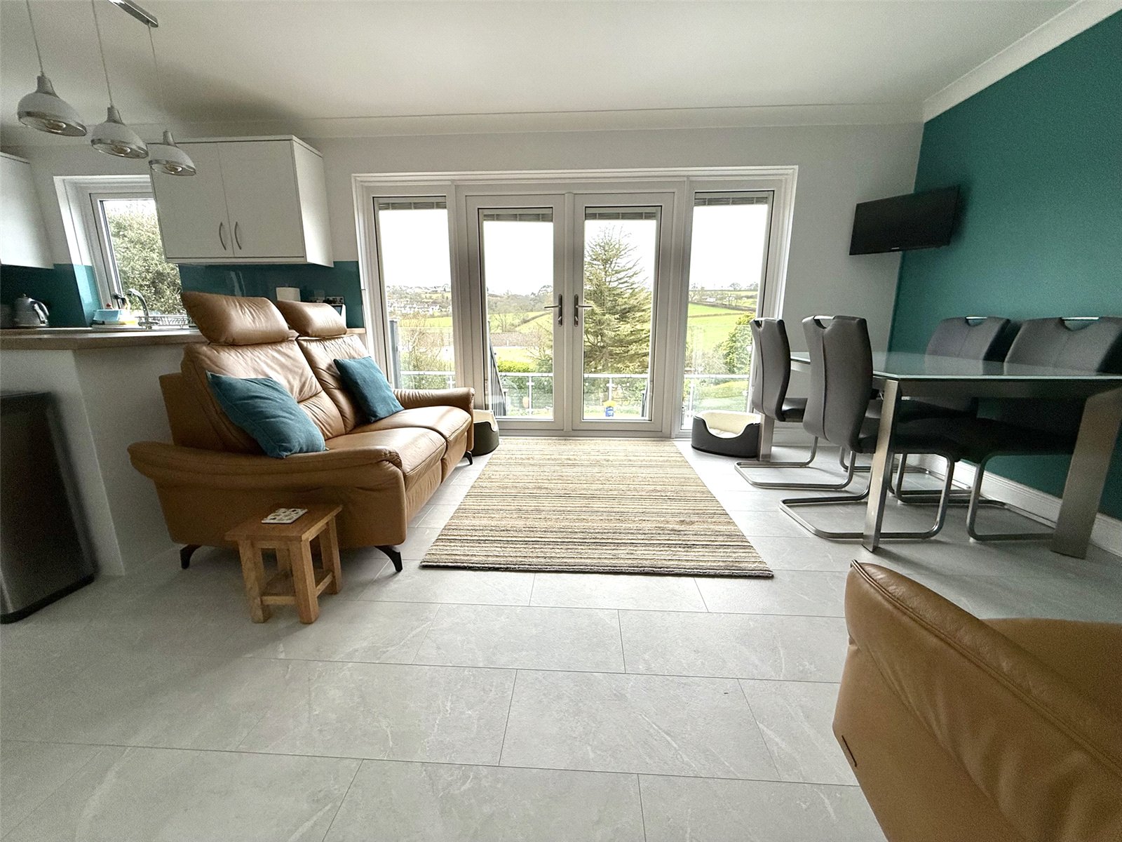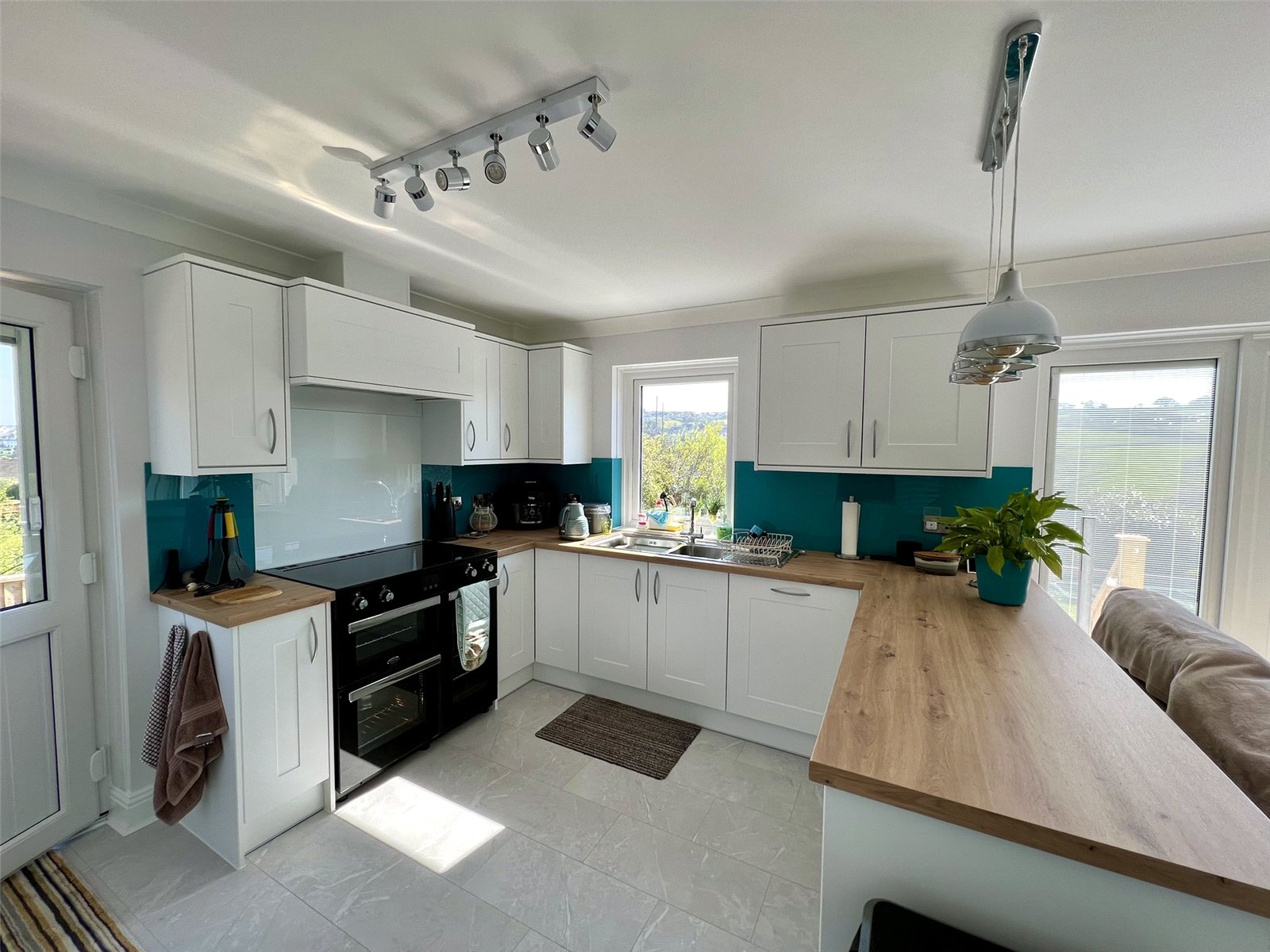 Bright and light from multiple windows and doors, the room features ample cabinetry for storage, providing a clean and organised space. White shaker style, soft close, wall and base units, larder unit with pull-out shelving, LED kickboard lighting and under cabinet lighting. Duropal artisan oak worktops with pop-up power & USB points, acrylic splashbacks. Belling range cooker, Neff extractor fan, Double wine cooler.