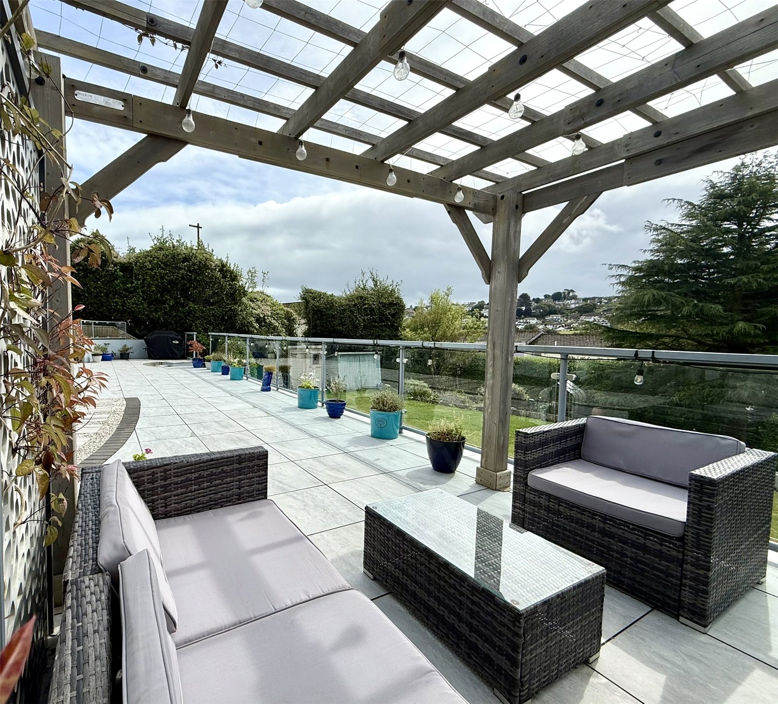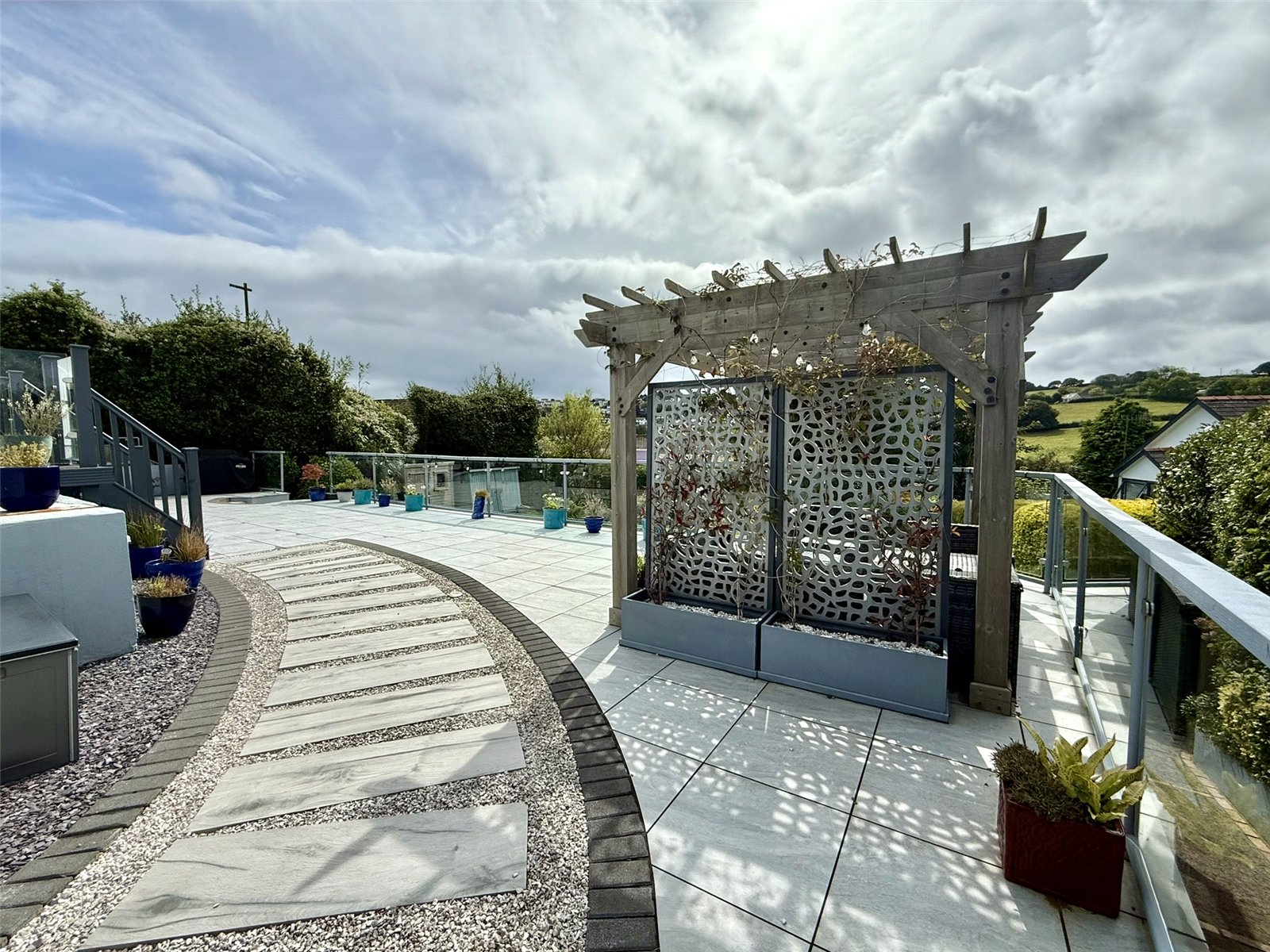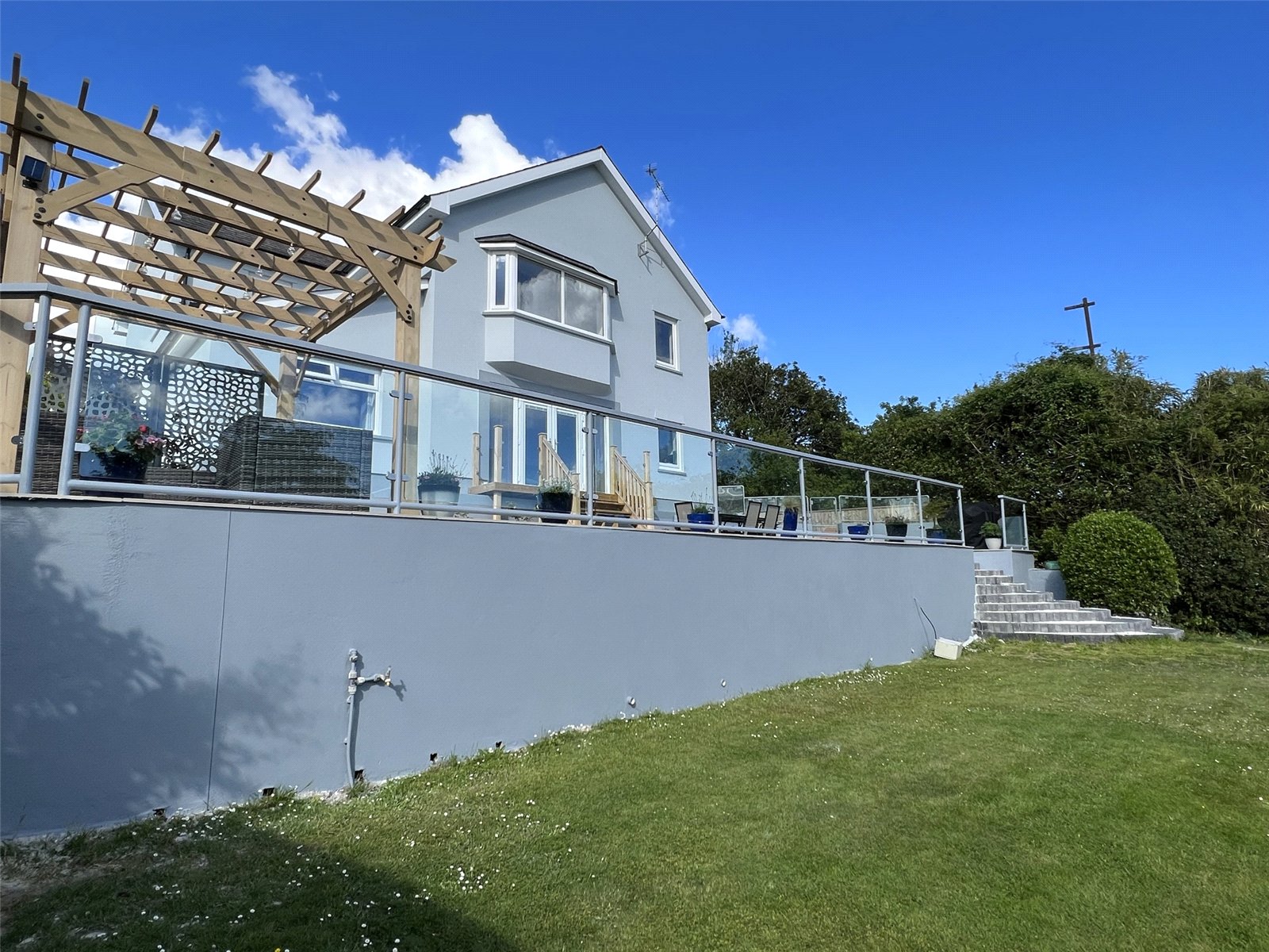 The property boasts a generous and well maintained South Facing private garden, tiered over three levels. Large patio to rear with Glass Balustrade, Porcelain tiles