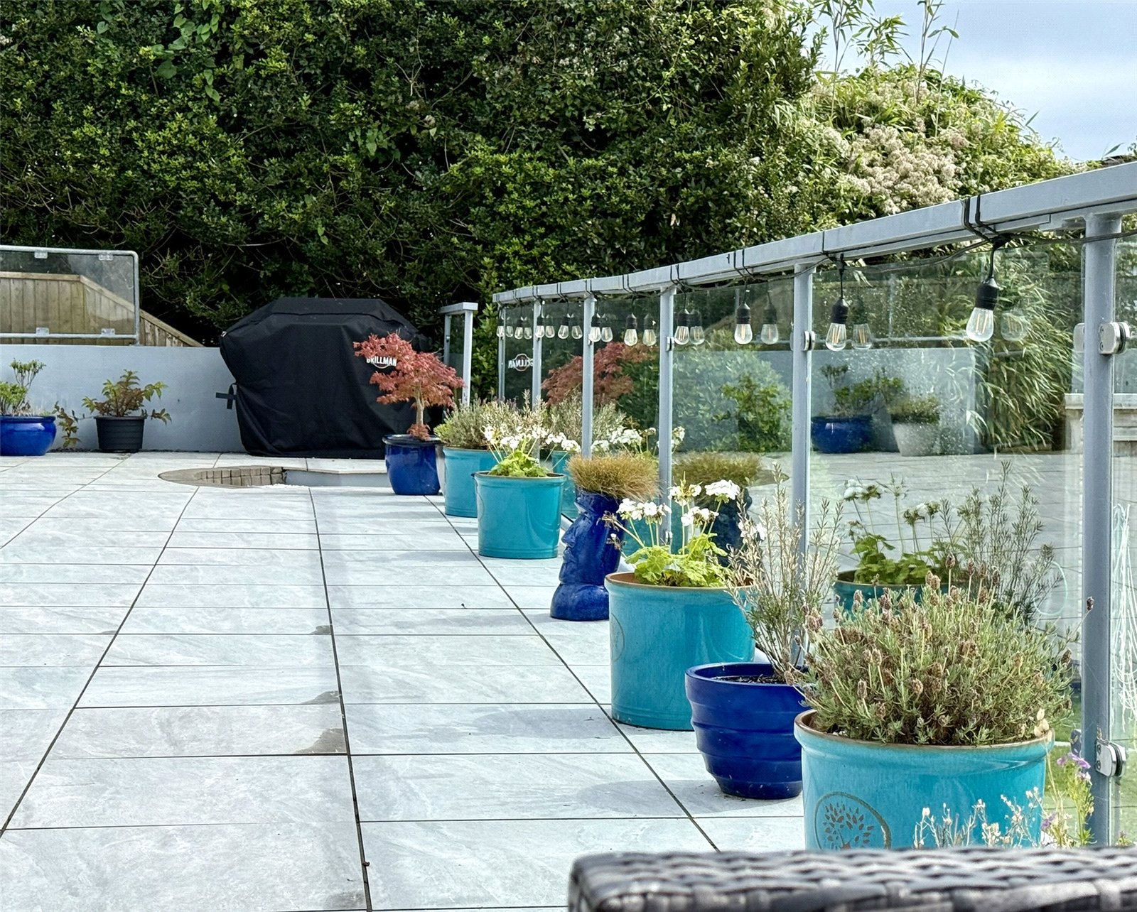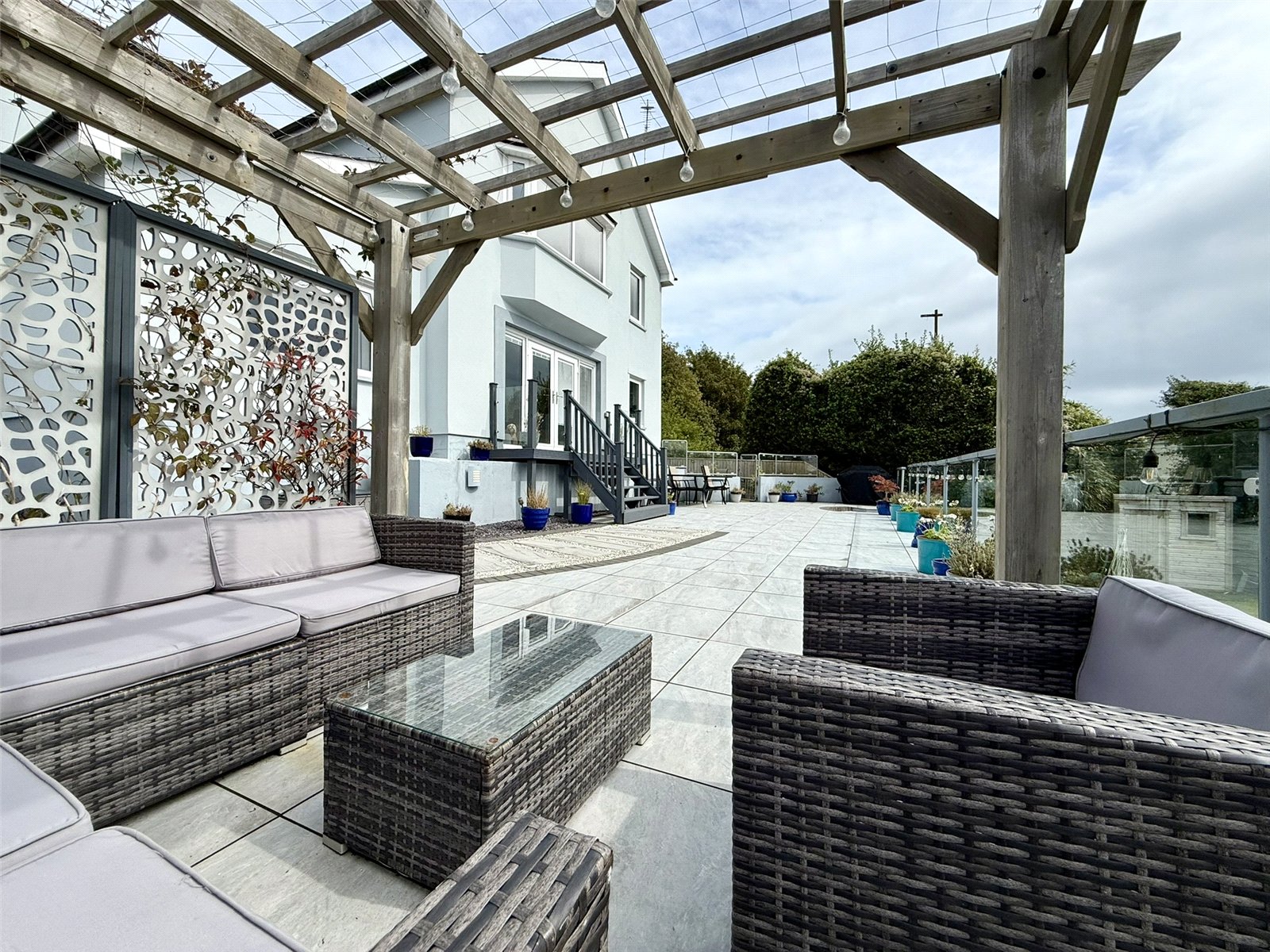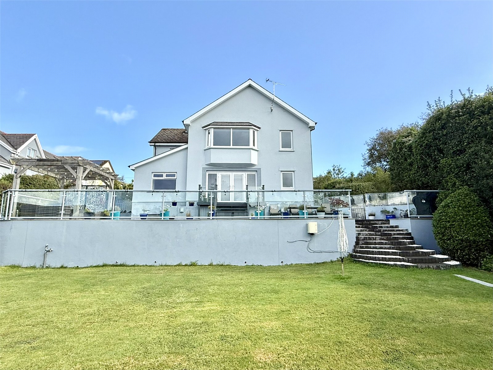 The property boasts a generous and well maintained South Facing private garden, tiered over three levels. Large patio to rear with Glass Balustrade, Porcelain tiles
