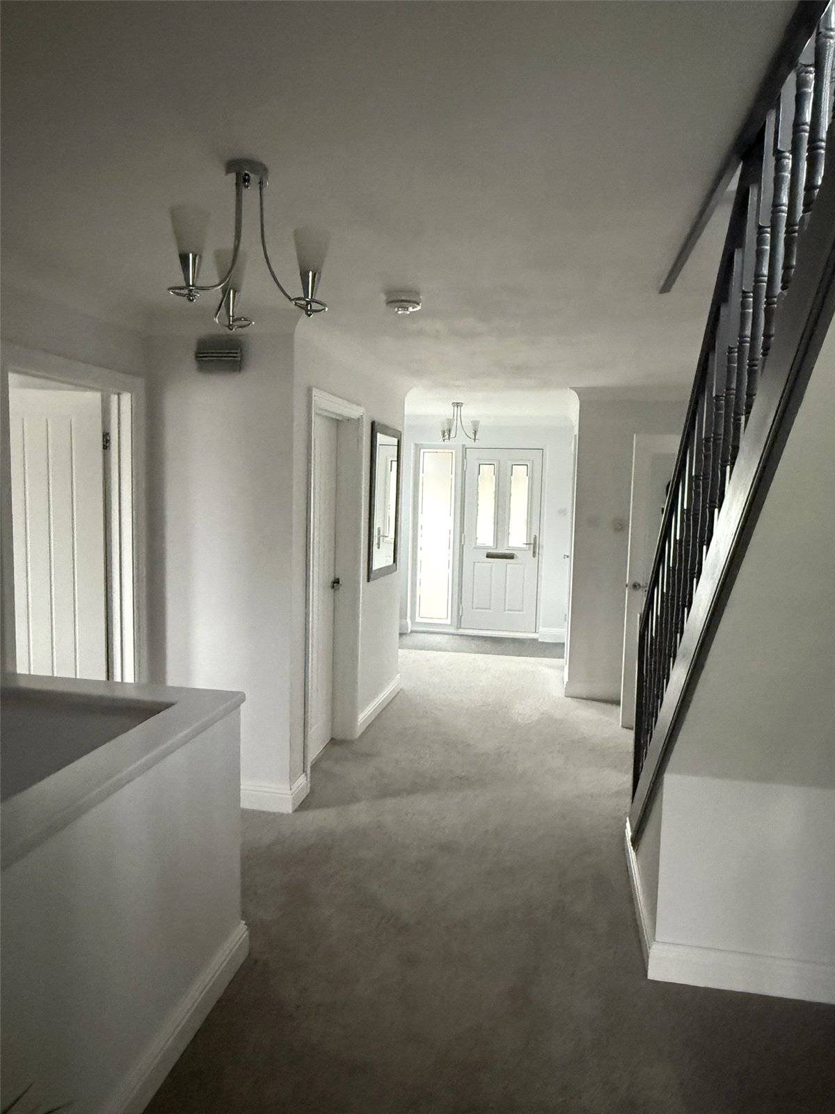 Doors leading to bedrooms, Lounge and kitchen/diner. Understair storage cupboard, Grey carpet, Radiator. Doorway leading to Staircase to Middle floor hallway.