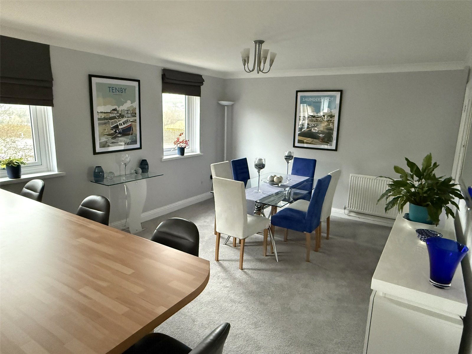 house, radiator, Integrated Bosch dishwasher, fridge, single electric oven and hob, extractor fan, Stainless steel Sink and drainer with mixer Tiled splashbacks. Grey tiled floor in Kitchen, Grey carpet in Dining area, two further windows to side aspect, radiator, glass