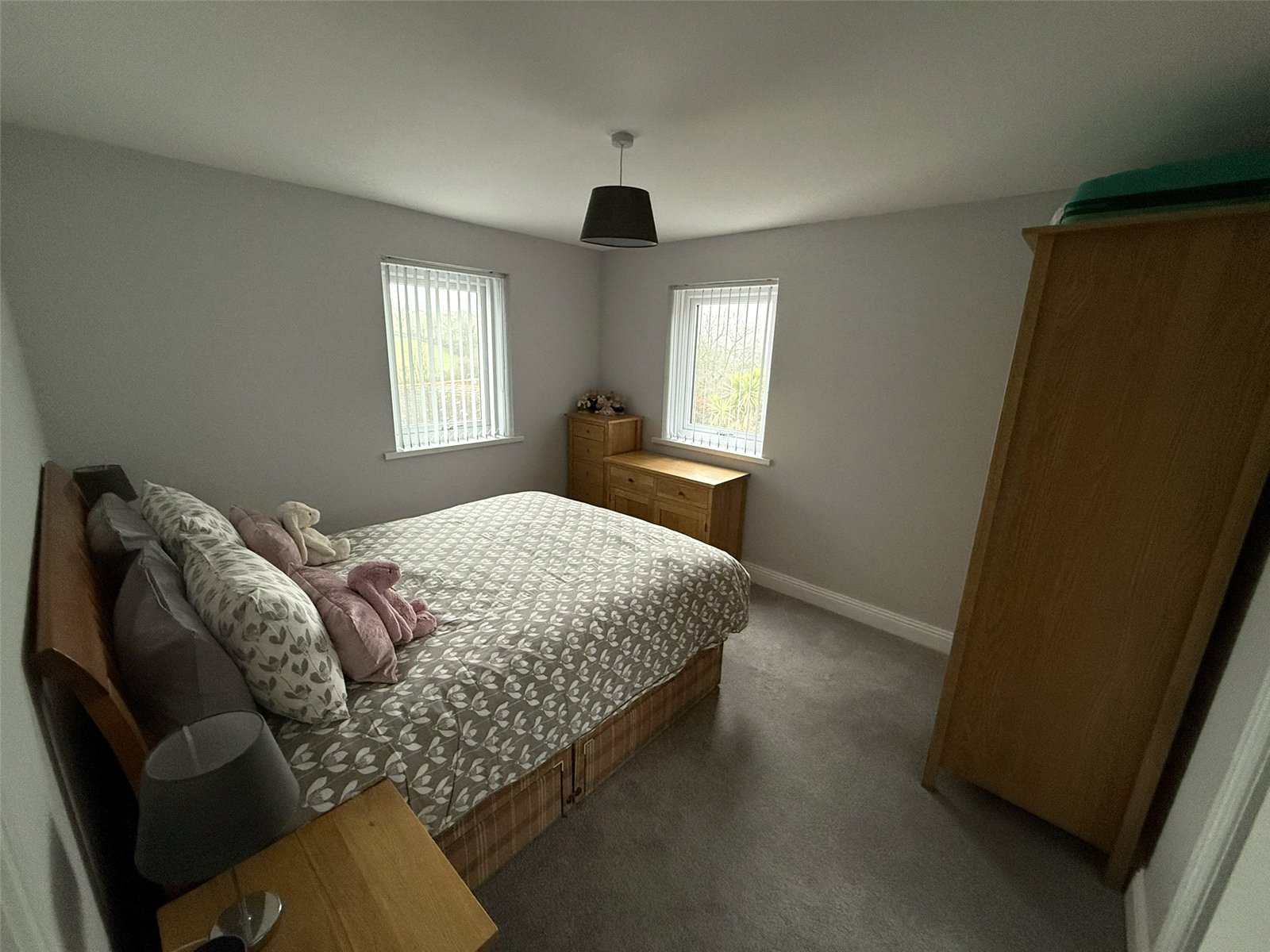 Dual aspect Double bedroom, two windows with views over rear and side aspects, Grey carpet, Radiator.