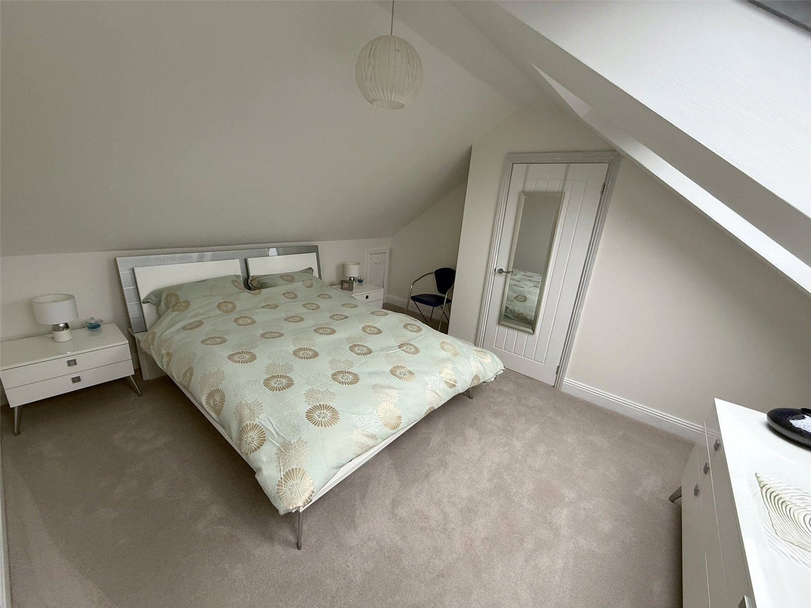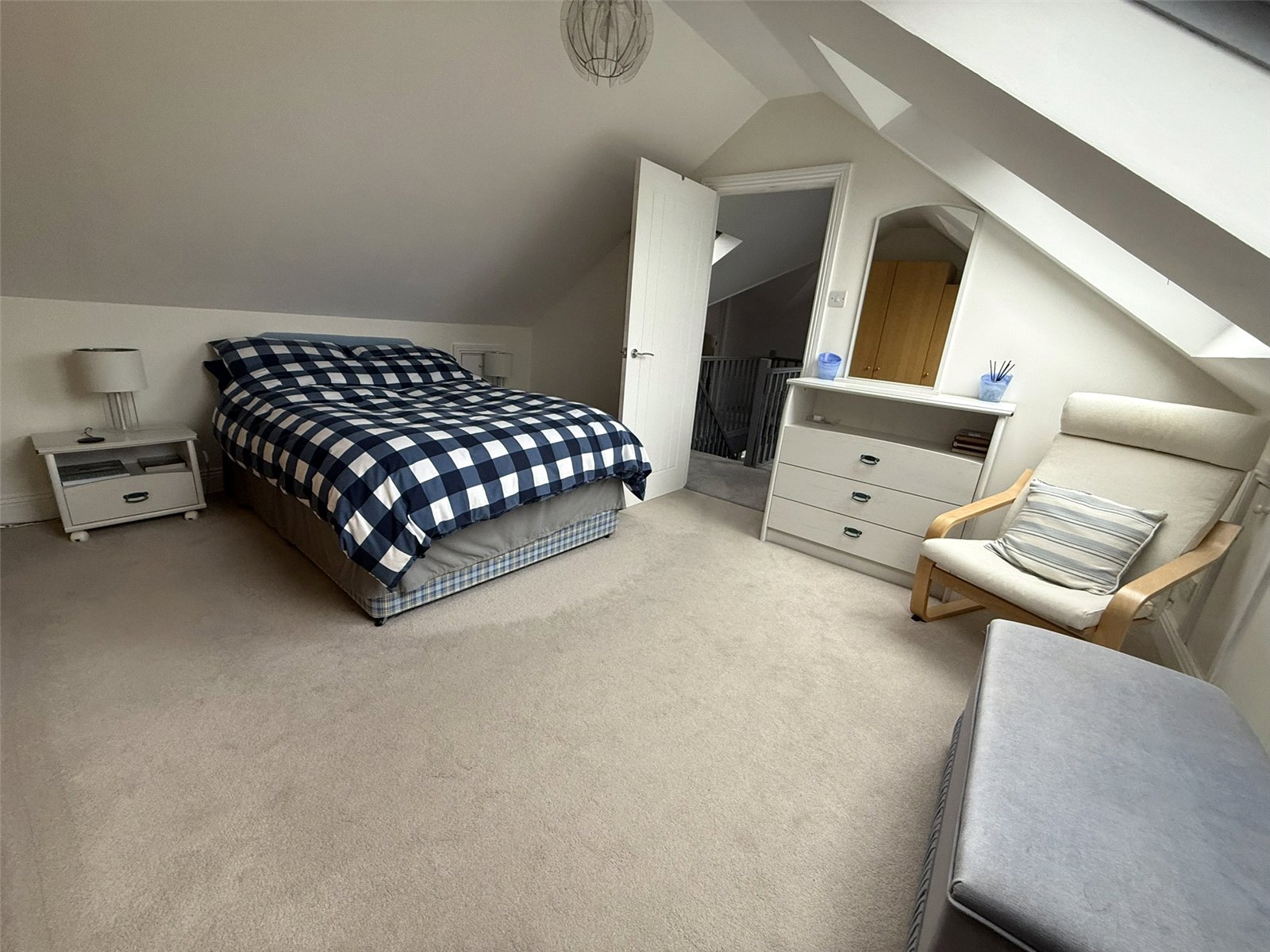 Double bedroom, Two Velux windows with sea views, Radiator and eaves storage, Cream carpet.