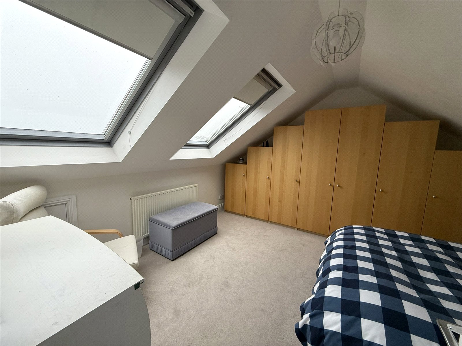 Double bedroom with two Velux windows, Cream carpet, Storage cupboard, Radiator and eaves storage.