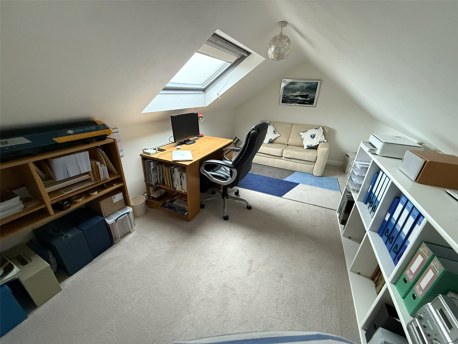 Velux window overlooking countryside,Radiator and eaves storage, Cream carpet.