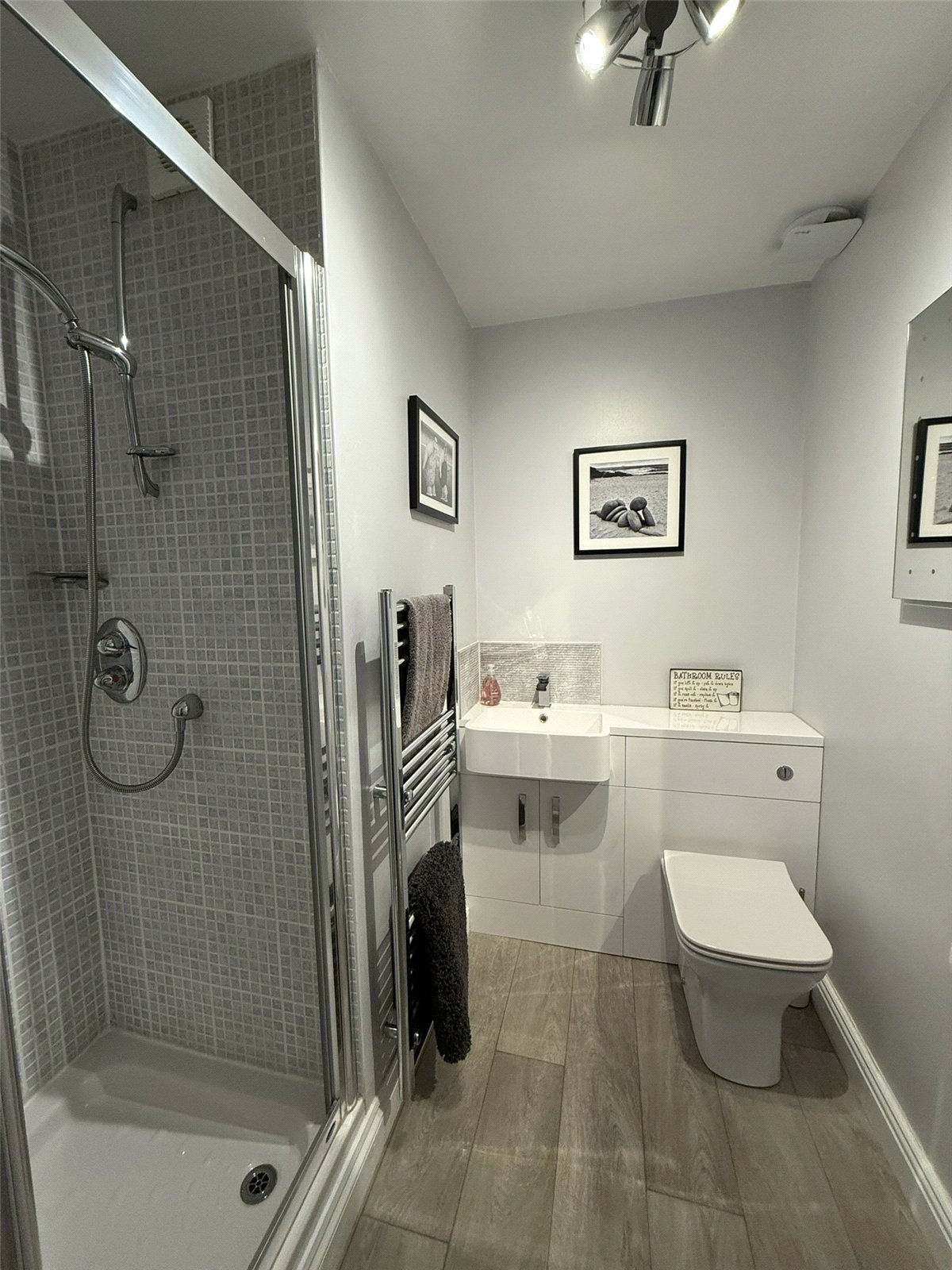 Large Aquadart 8mm glass screen Walk-in shower, Vanity and sink, fully tiled walls, Xpelair Simply Silent humidistat Extractor fan, dual power Towel rail, Cilantro rimless WC and LED wall mirror cabinet with integrated demister and shaver socket. Vinyl Flooring