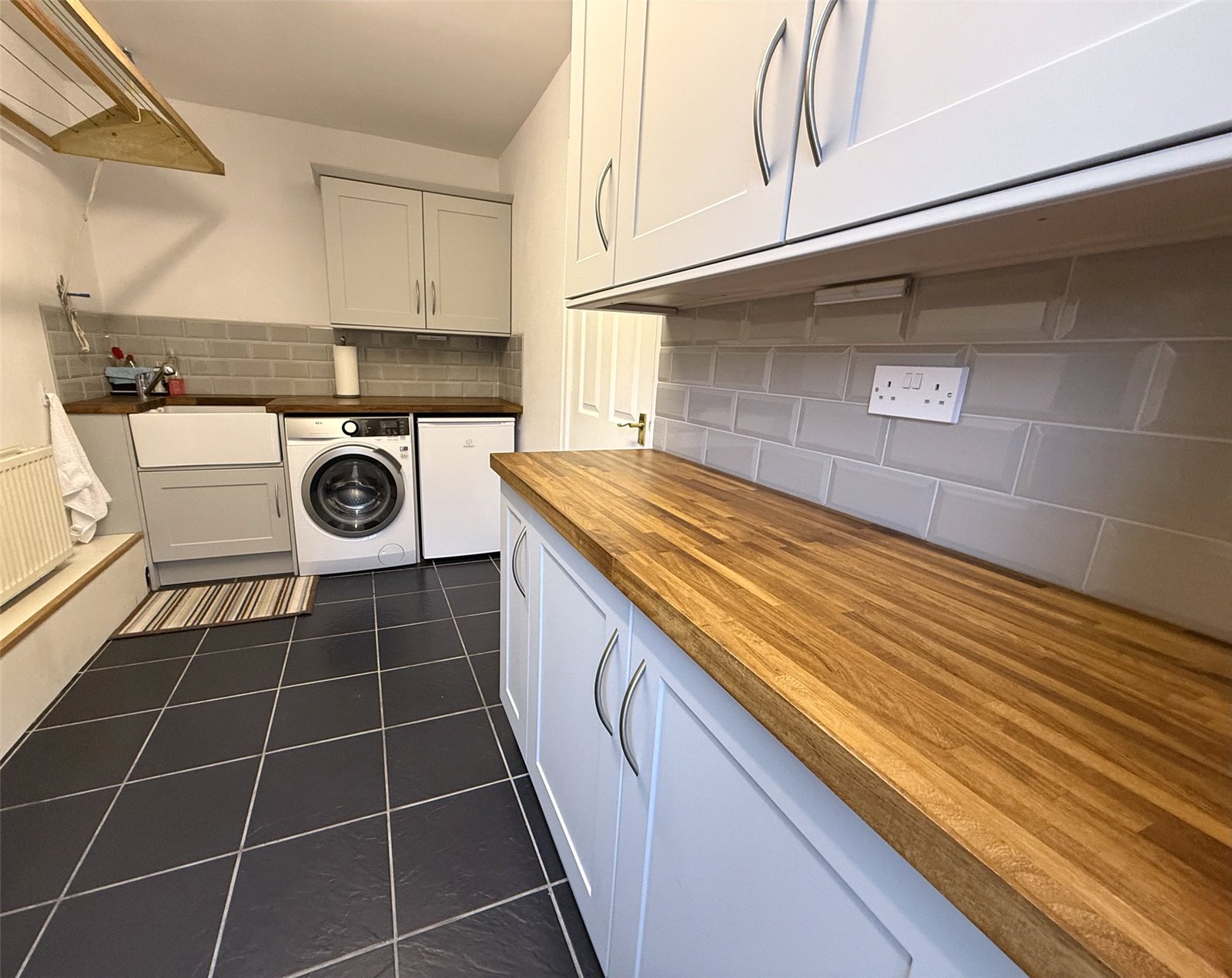 Light grey shaker style wall and base units, Iroko wooden worktops, Rangemaster ceramic Belfast sink, Mono Mixer Tap with Pull Out Rinser, radiator, storage cupboard, tiled floor, ceiling pulley drying rack. External UPVC half glazed door leading to side of property.