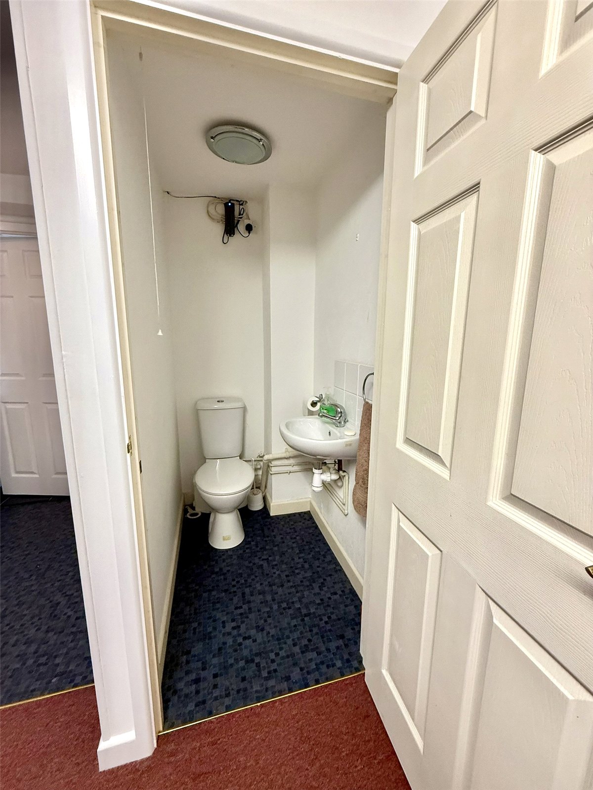 Composite door with obscure glazed side panel, Large double door storage cupboard, Grey Carpet, Radiator, Frosted Window, Two staircases leading to upper and