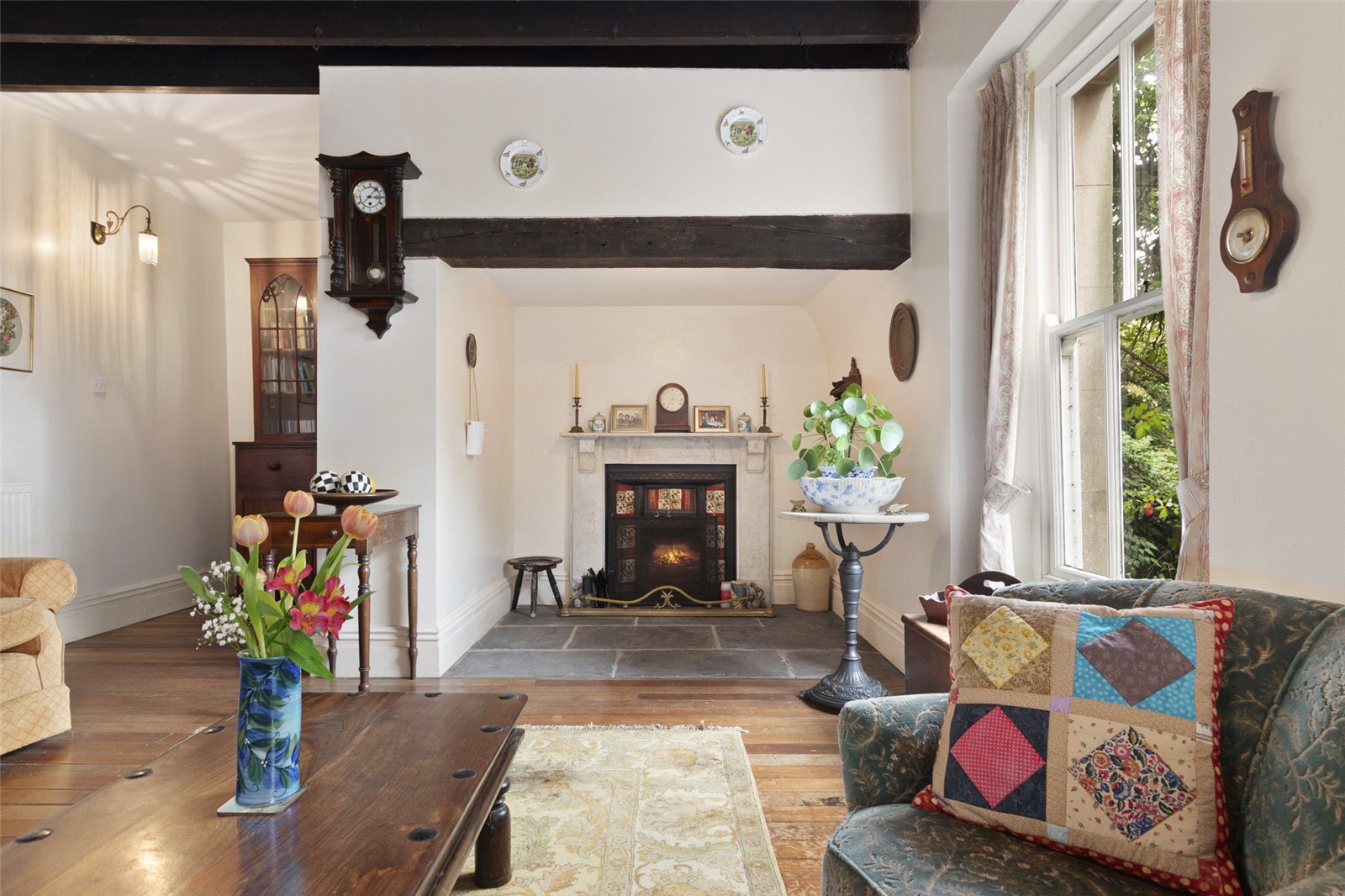 Features: Large exposed wooden ceiling beams, open fireplace with marble surround, wall lights, radiator.