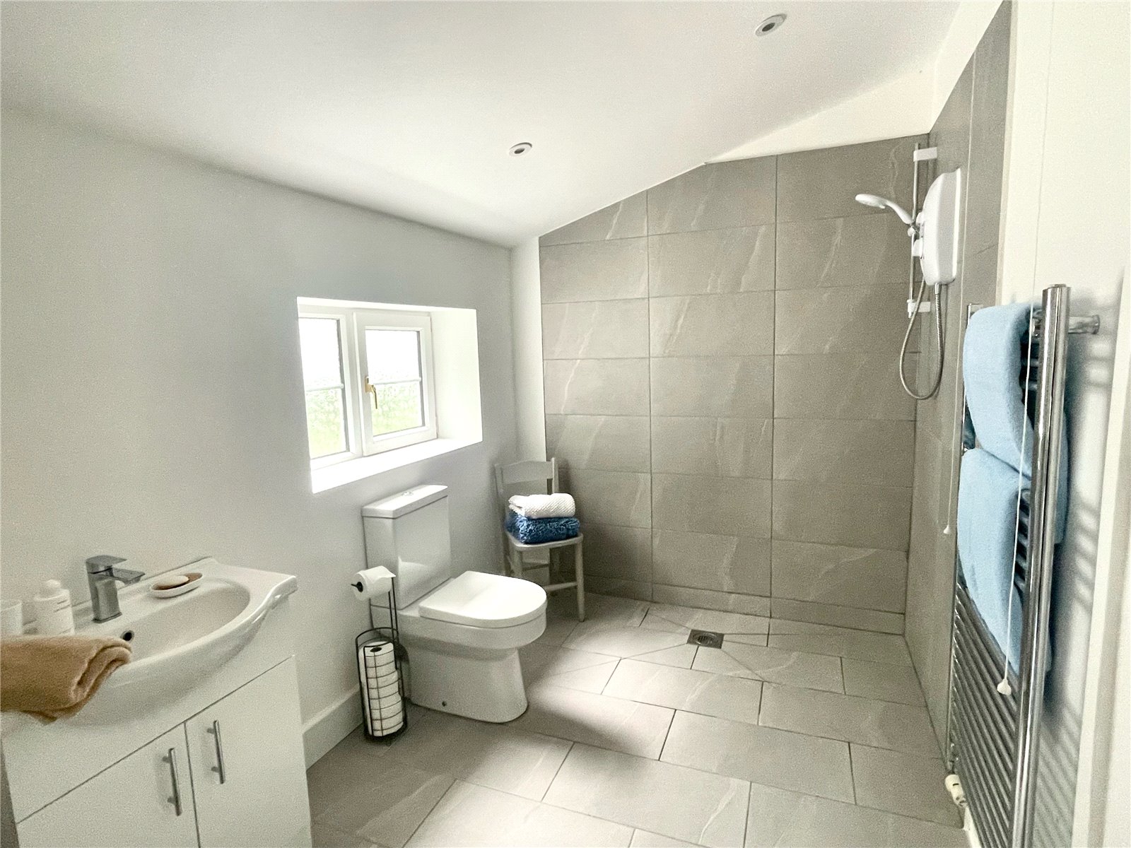 Tiled floor, electric shower with tiled surround, WC, wash hand basin with mixer tap in vanity unit, uPVC double glazed window with obscured glass, access to: