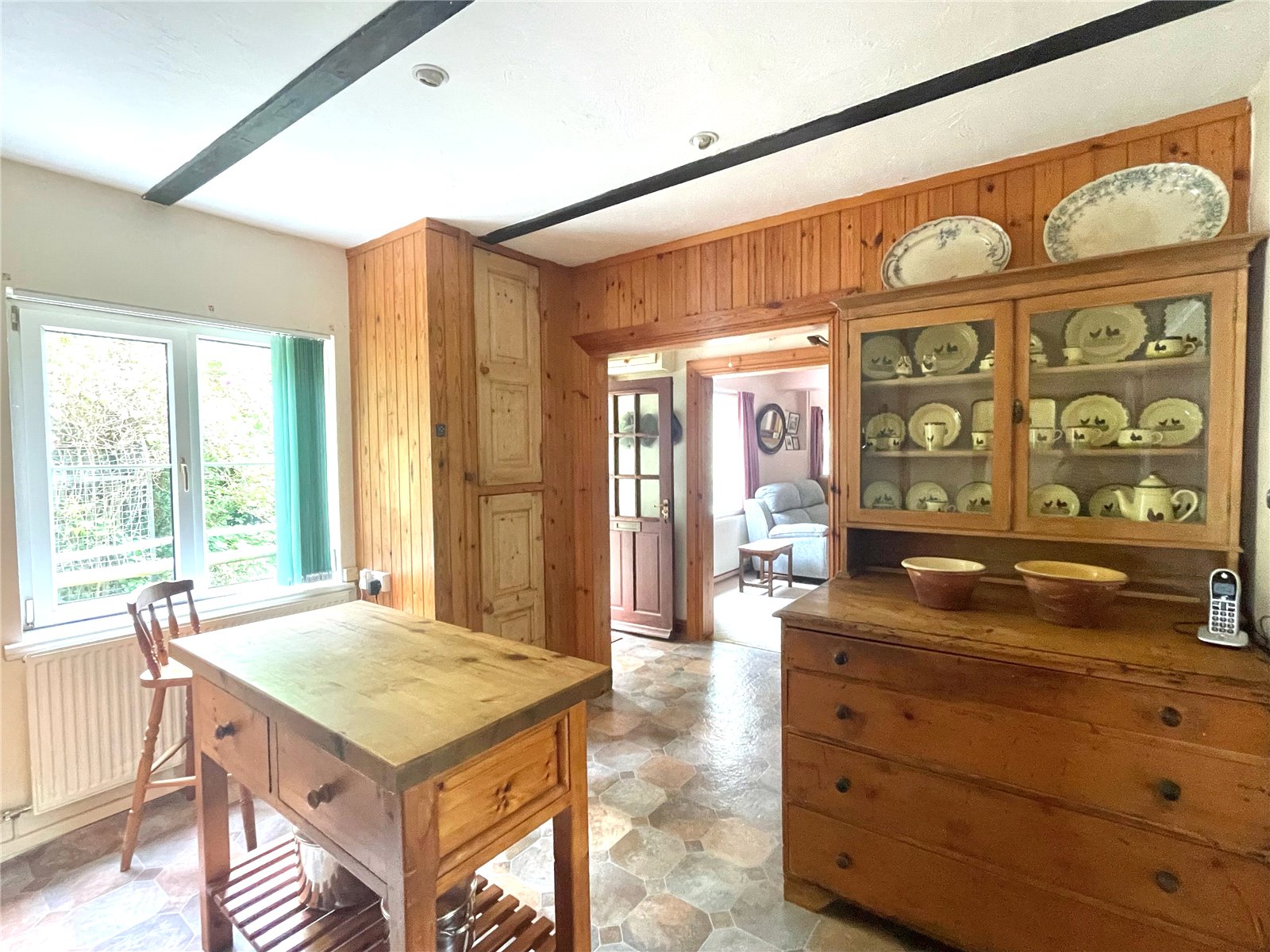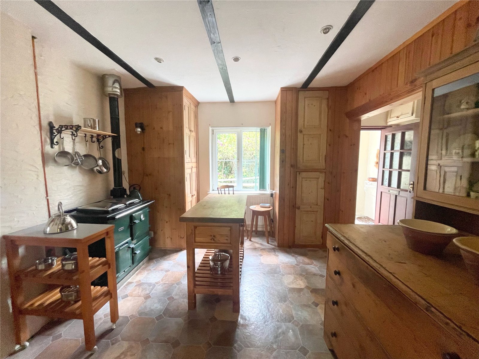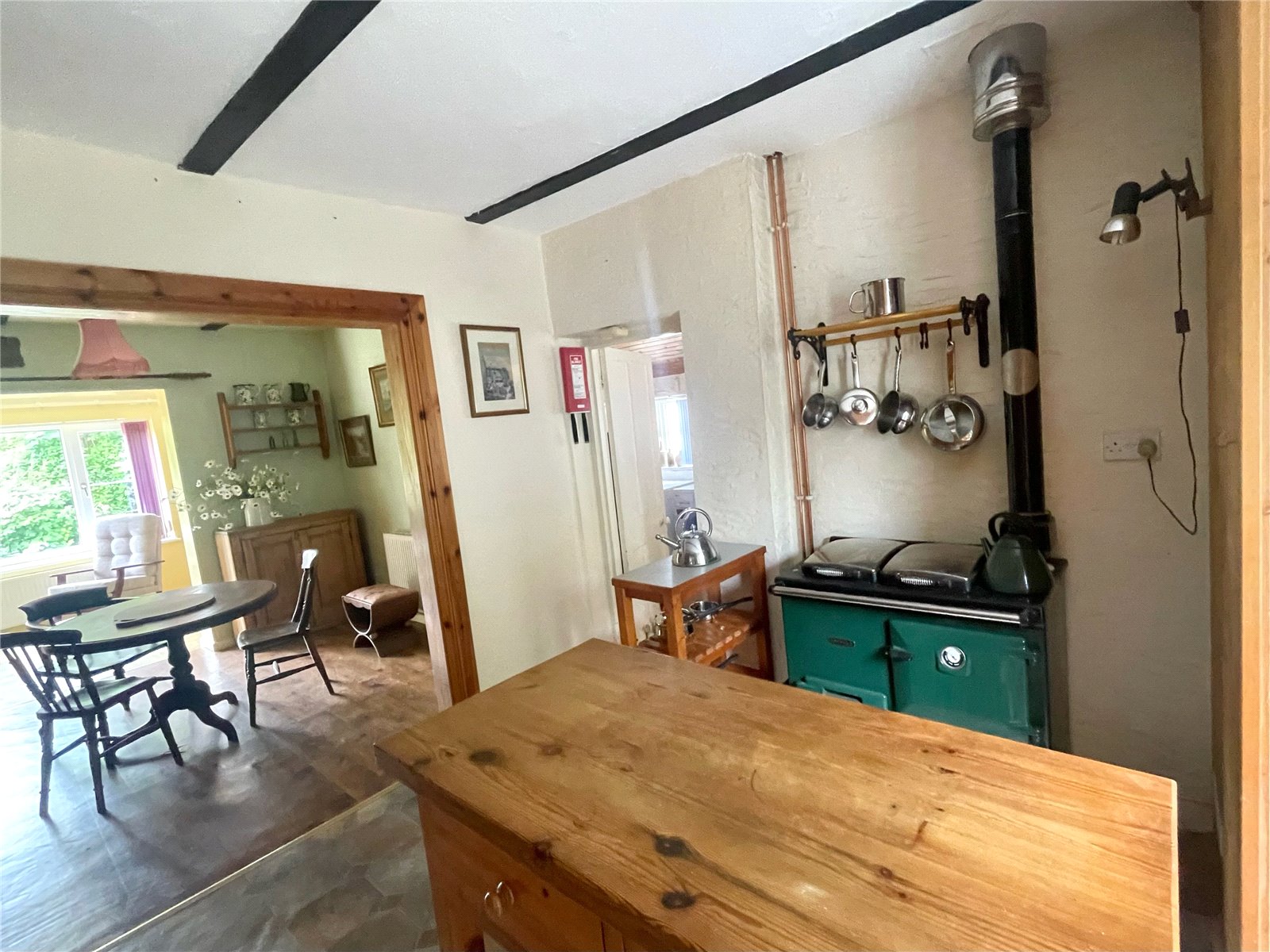 Linoleum flooring, uPVC double glazed window, floor to ceiling fitted units, Rayburn cooker, archway to dining room, access to: