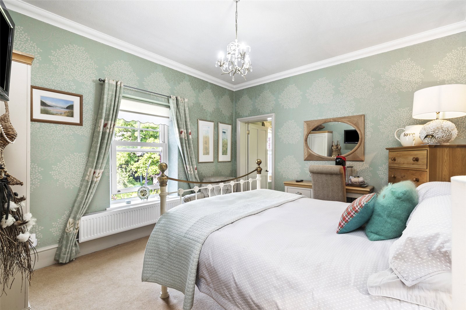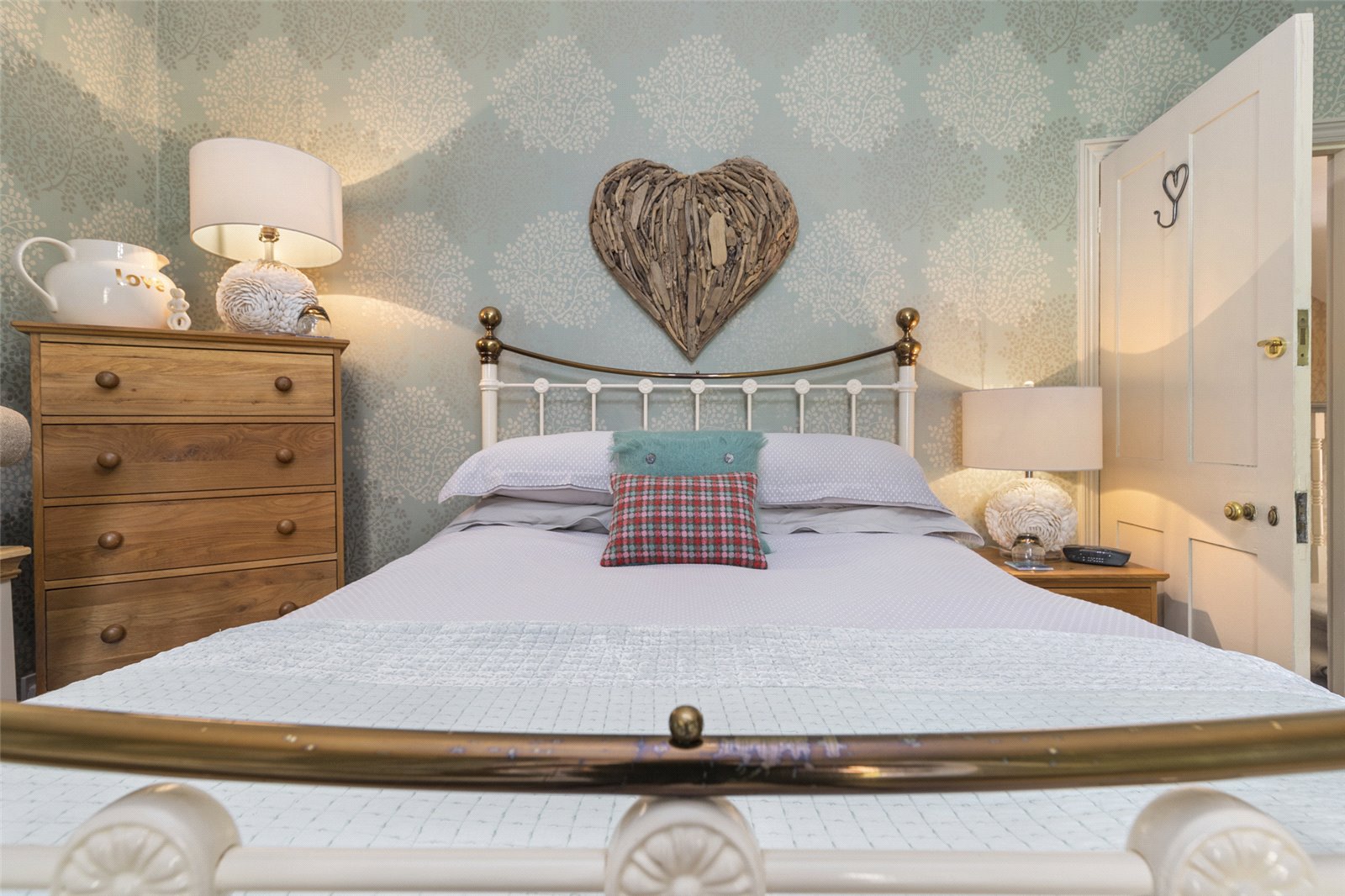 This is a flexible space, which could be used as sitting room to create a self contained living space, or as a good sized double bedroom. These two bedrooms would be ideal for anyone wanting to run the property as a bed & breakfast. There is space for a wardrobe and a chest of drawers. Additionally there is a cast iron fireplace. To the side is a panelled double glazed window with partial water views.