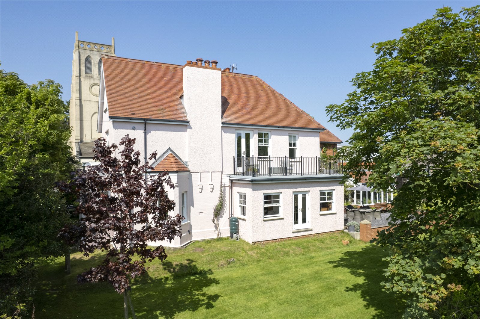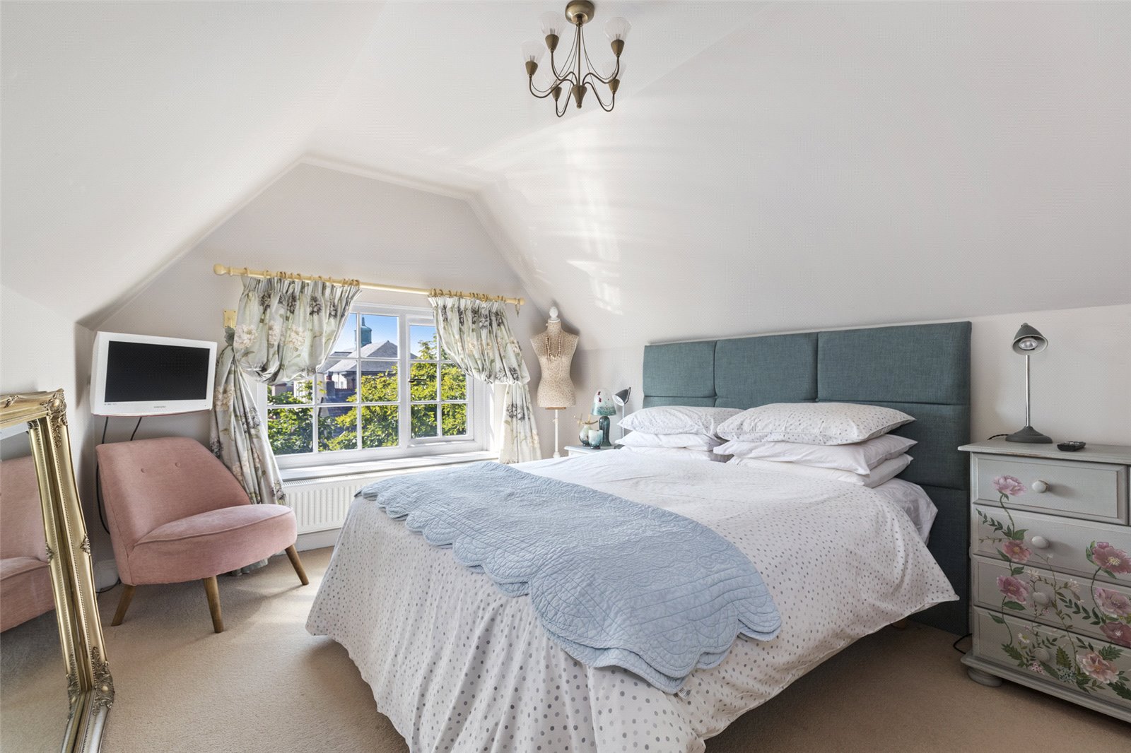 This is a light and bright large double bedroom, which reflects the creative combination of contemporary and traditional that epitomises this property. This is reflected in the original cast iron fireplace, and the casual seating area with space for a sofa. The large modern double glazed window to the side overlooks the church