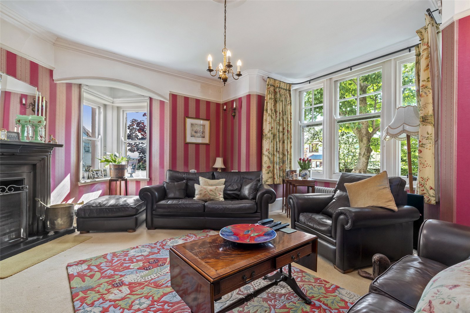 The corner bay window lets lots of natural light into this large reception room. With space for sofas and armchairs it is the perfect place to relax. There is an open fireplace, and three ornate pattered radiators which help to create a warm and welcoming atmosphere.