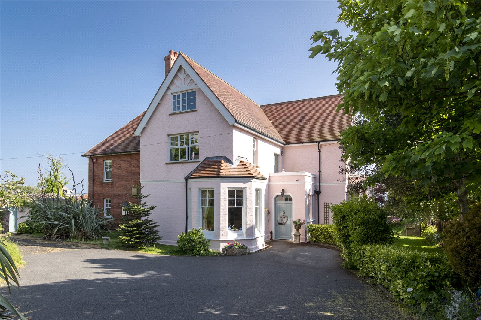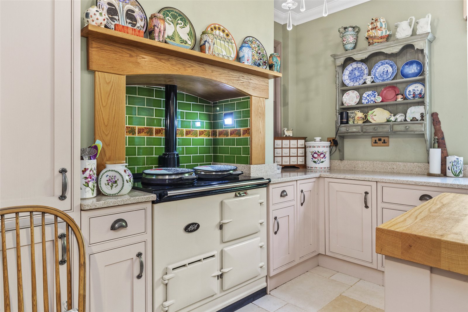 Designed by leading local company Lawrence Lyons, this fully fitted oak kitchen has base & eye level units which provide excellent storage. The light granite worktop reflects the quality feel, which is further enhanced by the limestone tiled floor. For anyone who enjoys cooking then this kitchen is well equipped with a two oven/two hotplate gas fired AGA, which is in a inglenook type setting. Additionally there is a large built in Neff electric oven, and a single oven/grill. Set into the island unit is a Neff five burner gas hob (including a wok burner) with an extractor over. The island unit has useful drawers and cupboards. Also there is a built in Neff dishwasher, Neff microwave, and a Neff coffee machine. The Welsh style dresser complements the styling of the kitchen perfectly. The enamel one and a half bowl sink has a swan neck tap, and a boiling water/filtered quoker hot water tap. Natural light comes in from the two sash windows to the front. To the side is a walk in pantry. The breakfast area has room for a table and chairs. The French doors leads onto the terrace. Door to:
