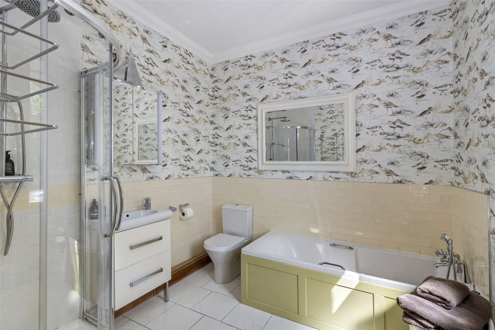 Steps down to this ‘Jack and Jill’ bathroom with additional access to the rear landing. This is equipped with a bath, WC, and wash hand basin. There is a frosted window to the rear.