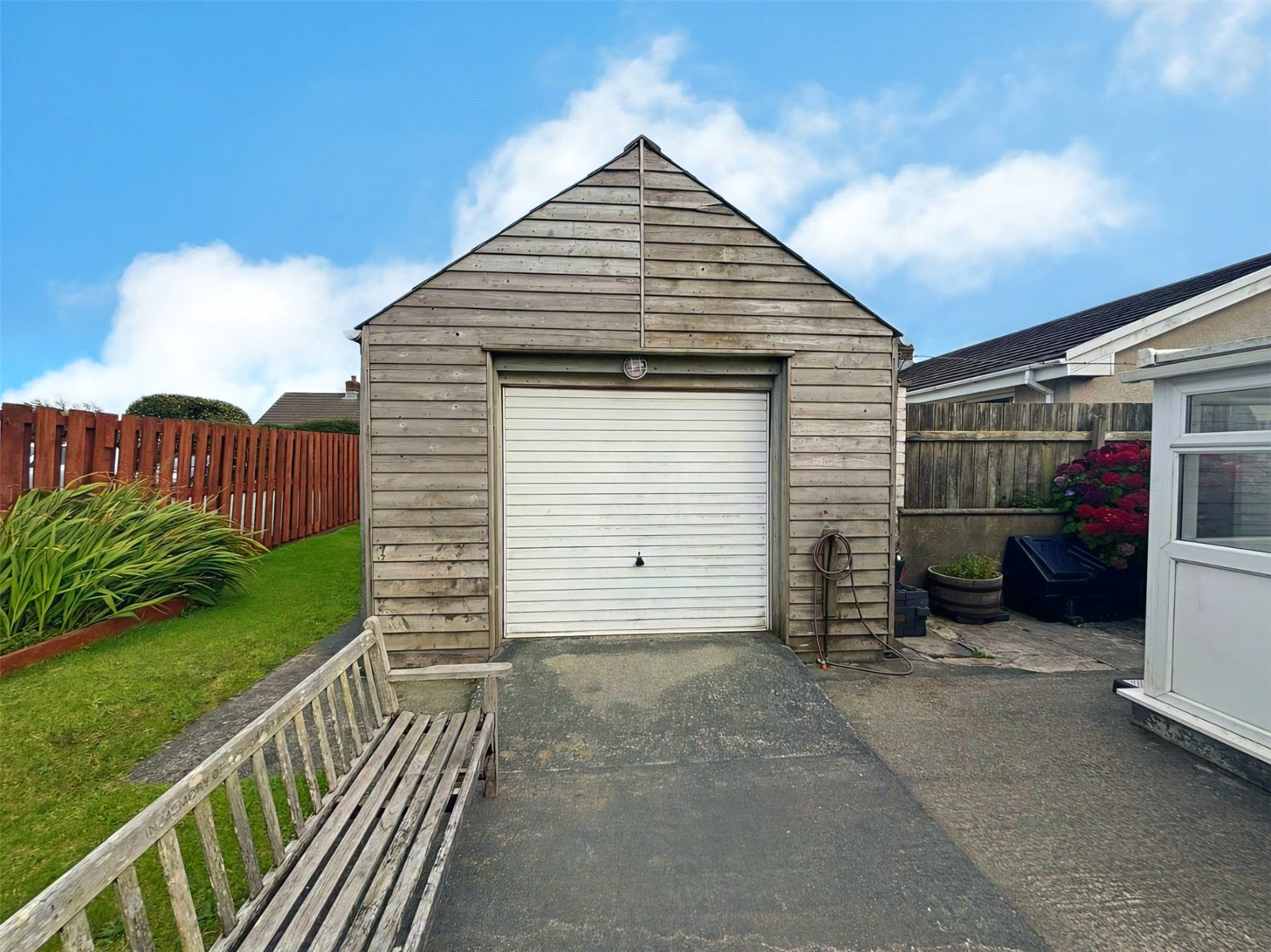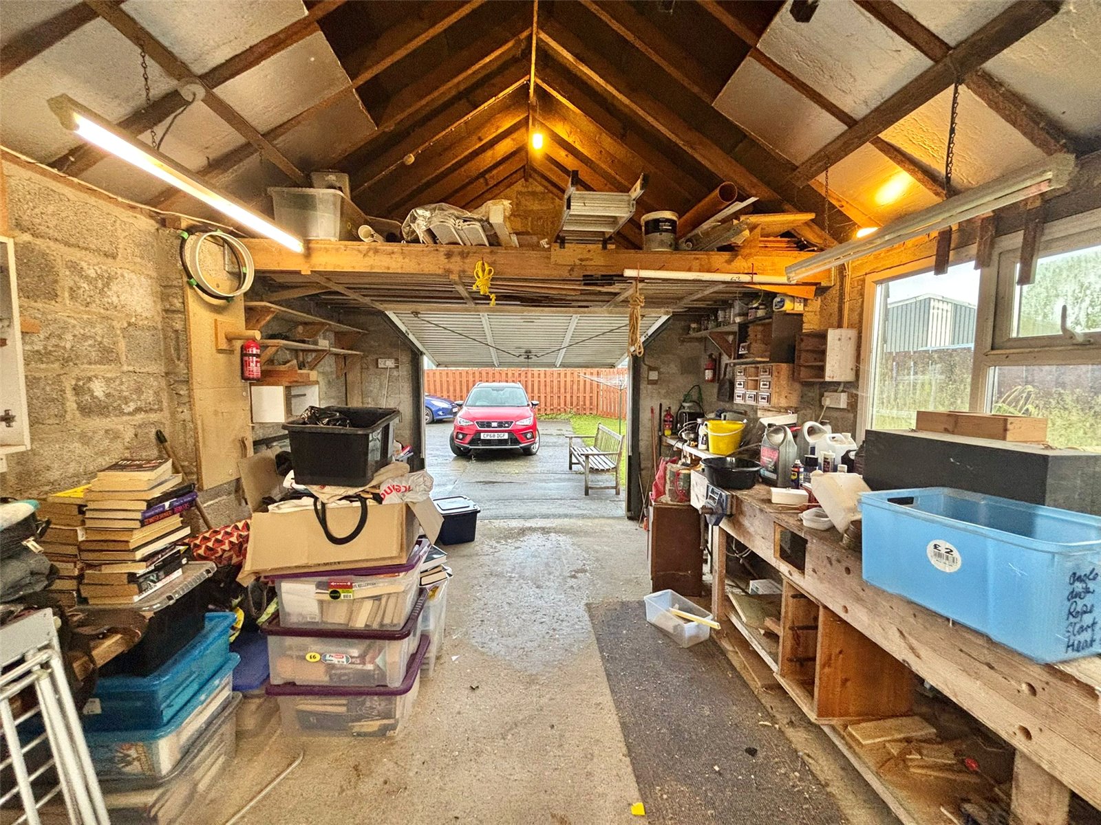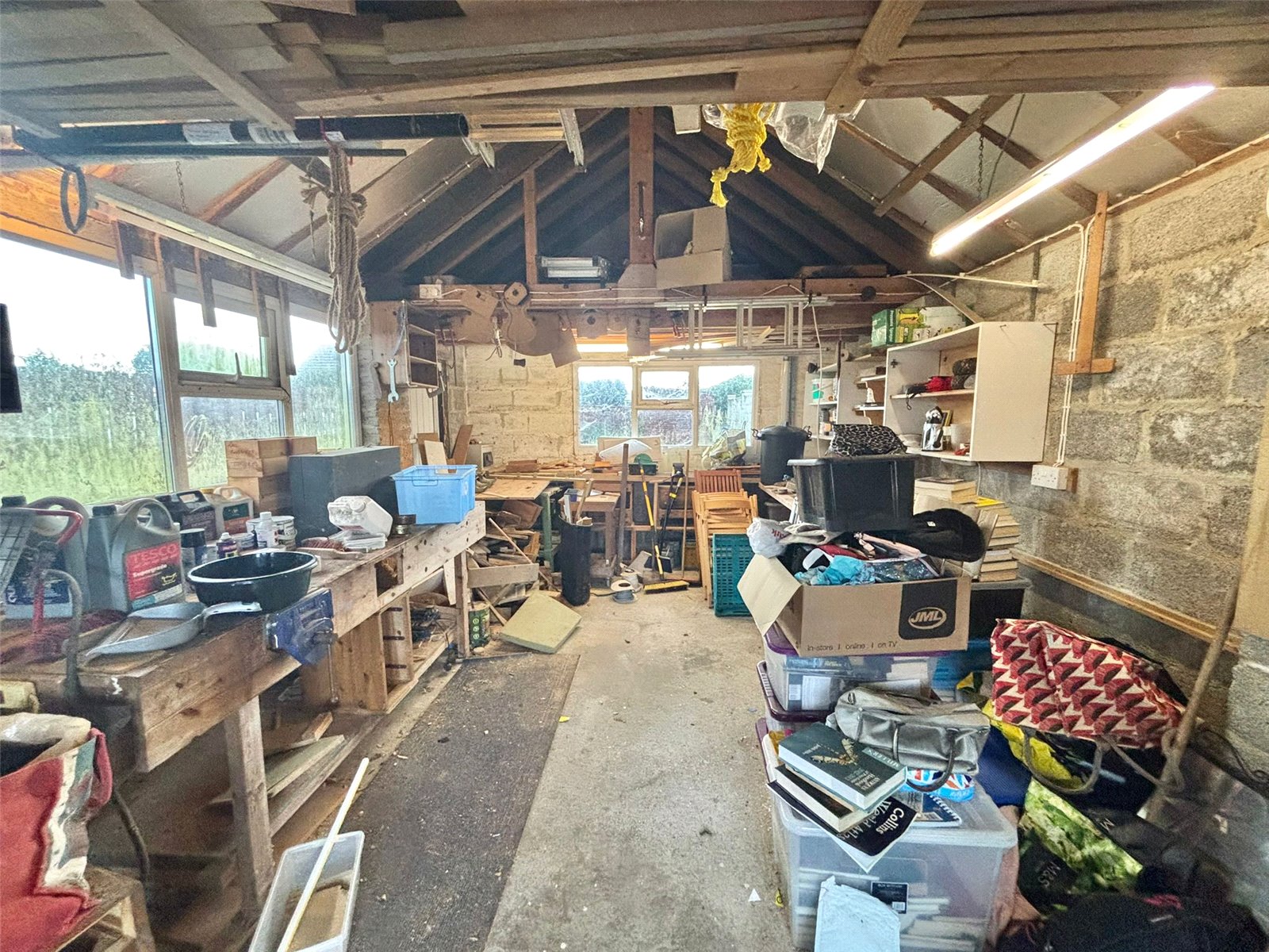 This property includes a generously sized and completely detached garage, offering an ideal space for a workshop or additional storage. The building benefits from mains electricity, an extensive workbench, and a useful overhead storage area, providing incredible versatility for hobbies or vehicles.