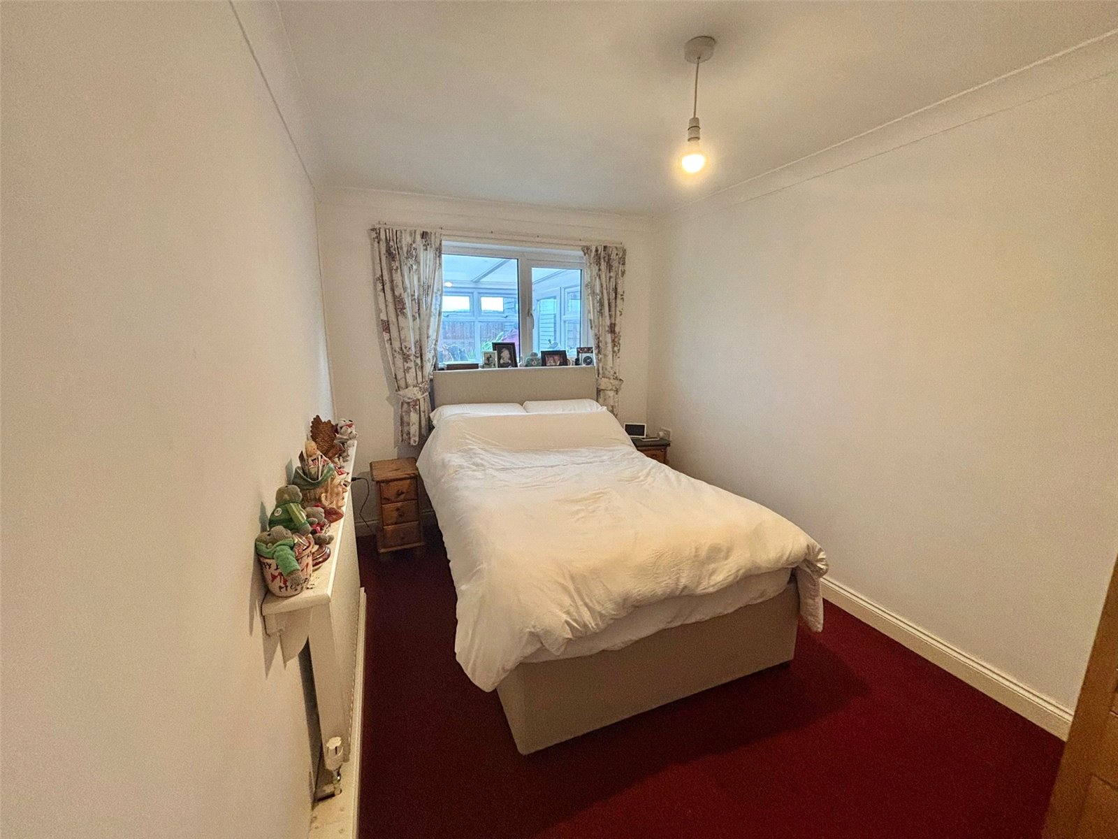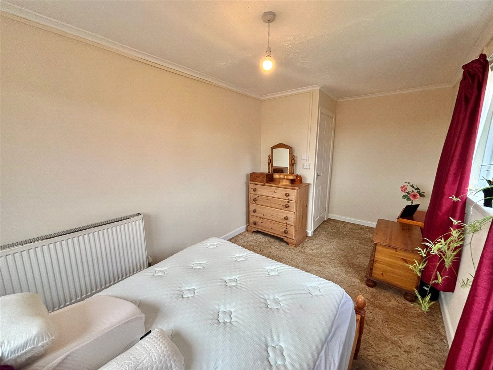 This tranquil bedroom is a cozy retreat, featuring a plush, deep red carpet that adds warmth and a touch of luxury. The crisp white walls and minimalist decor create a bright, inviting atmosphere. A large window at the far end allows for plenty of natural light, making this a perfect space for unwinding.