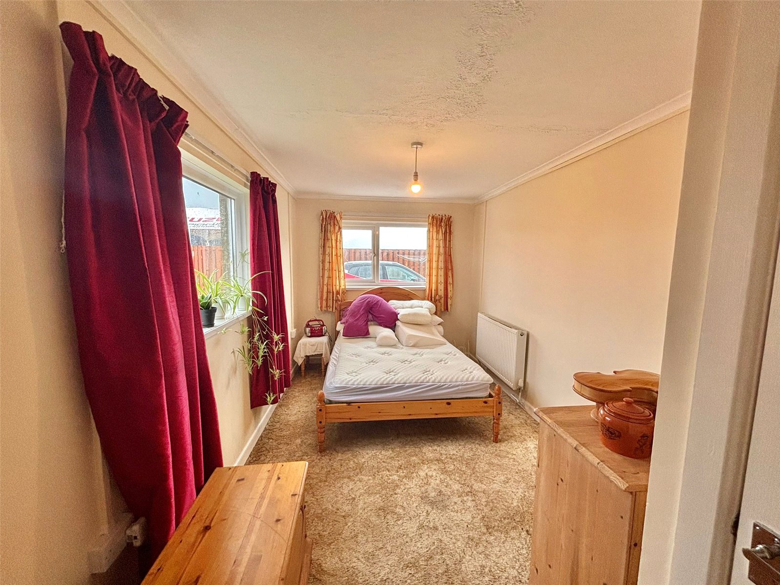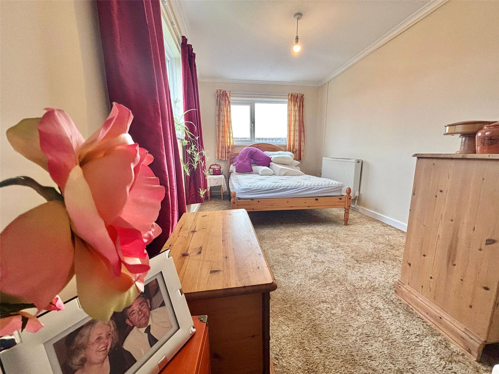 This inviting bedroom offers a serene and spacious retreat. Filled with an abundance of natural light from its large windows, the room features a soft, flecked carpet and a neutral color scheme, providing a blank canvas for personal style. The timeless wood furnishings and vibrant curtains add warmth and character to the space.