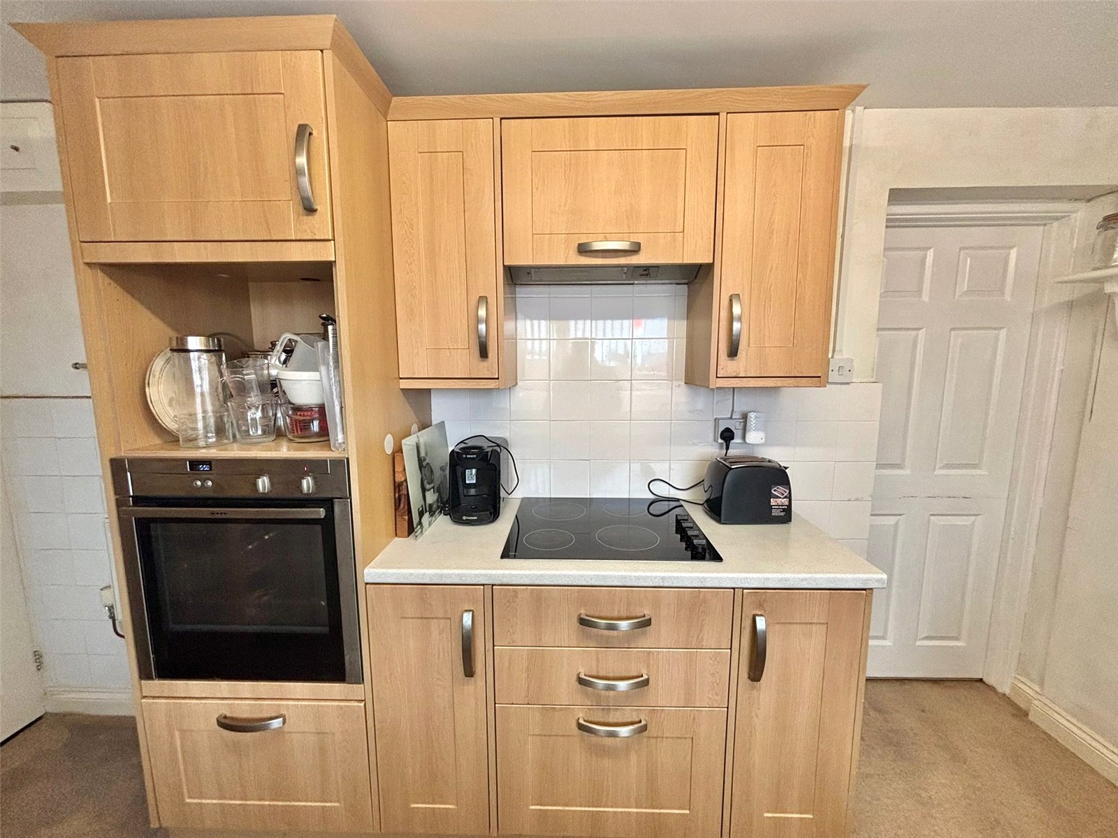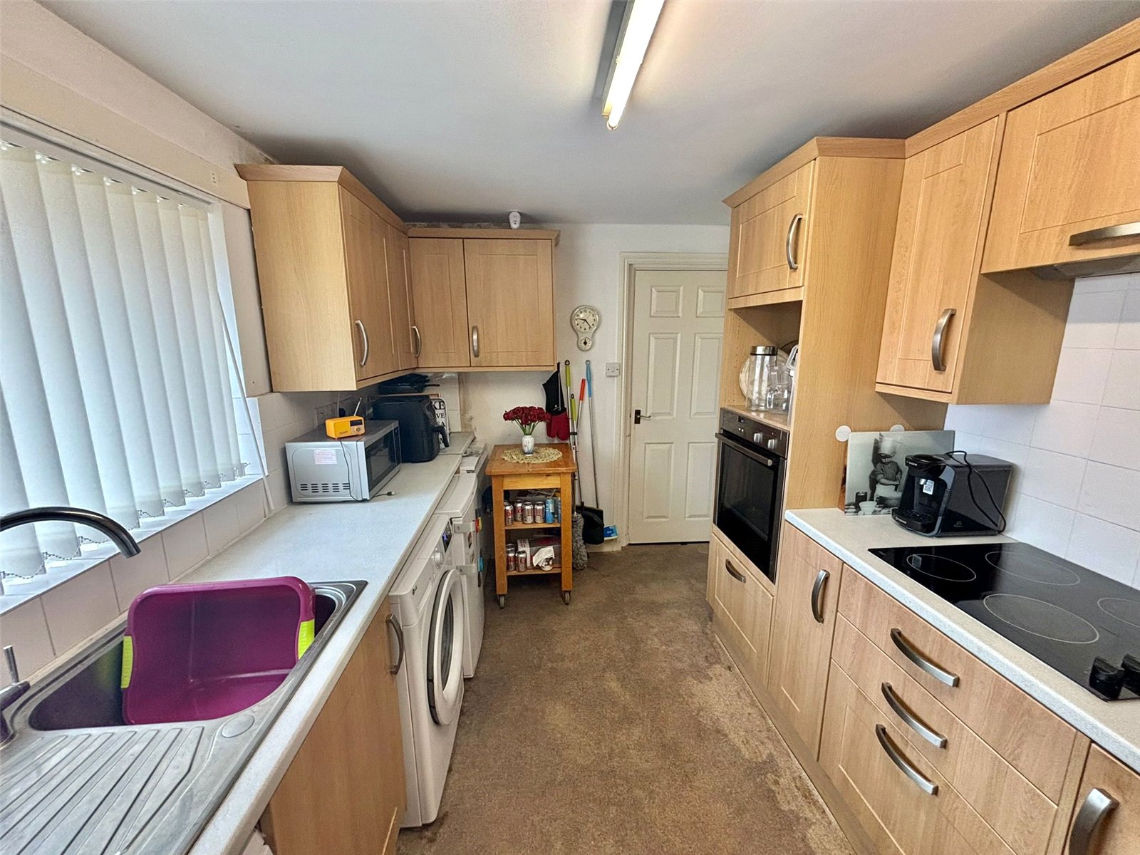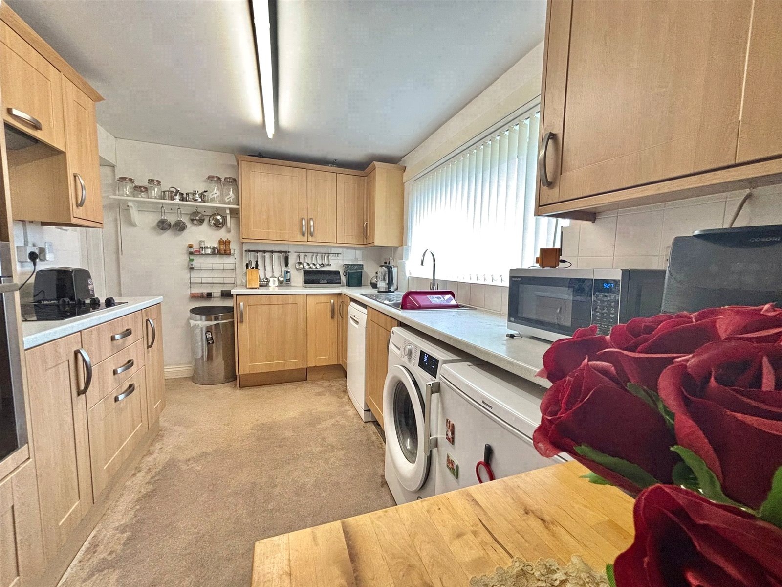 This bright and functional kitchen is designed for efficiency and ease of use. It features a streamlined layout with a generous amount of worktop space and a large window, ensuring the room is filled with natural light. The practical design offers ample storage and provides the perfect backdrop for daily meal preparation.