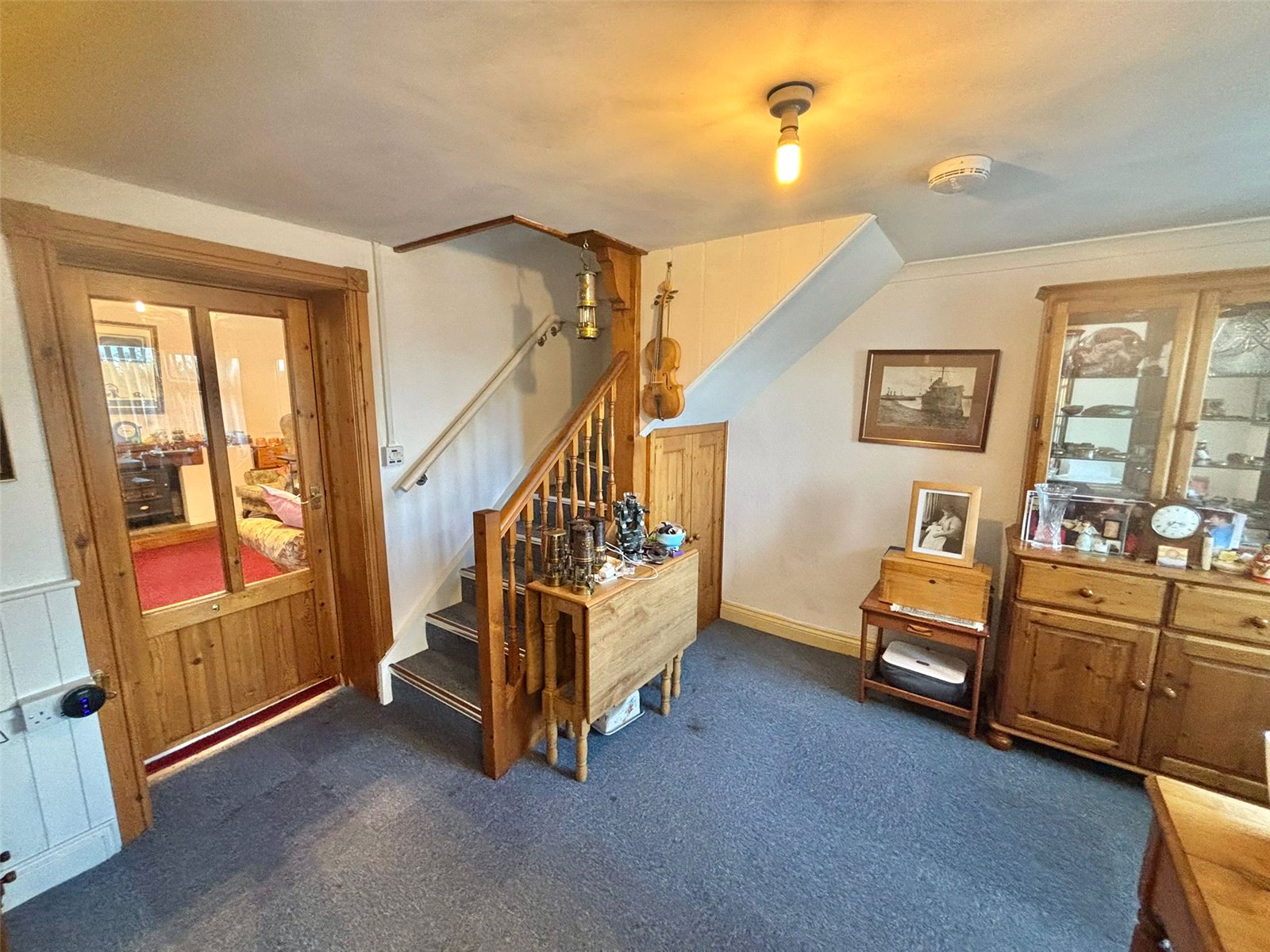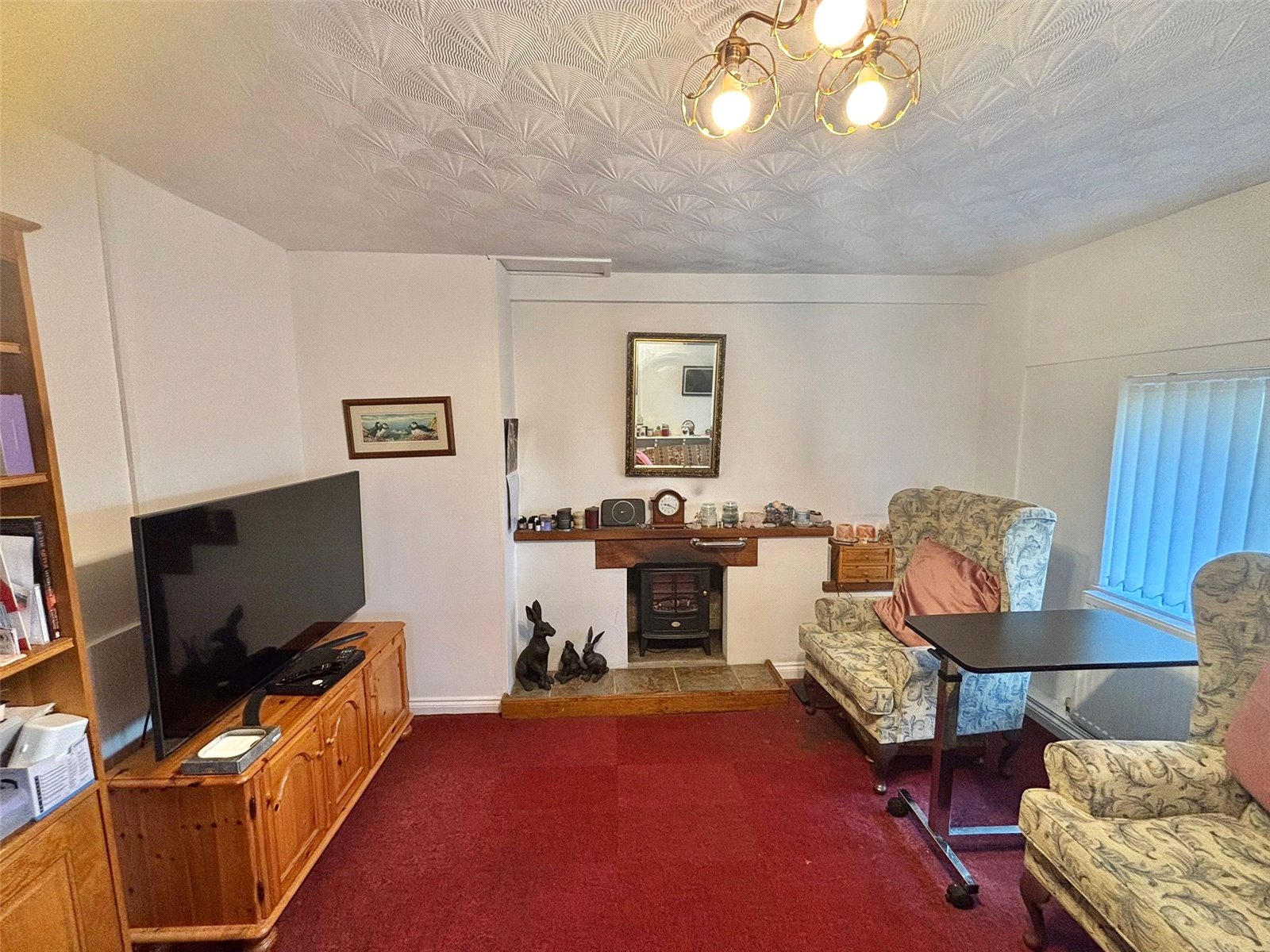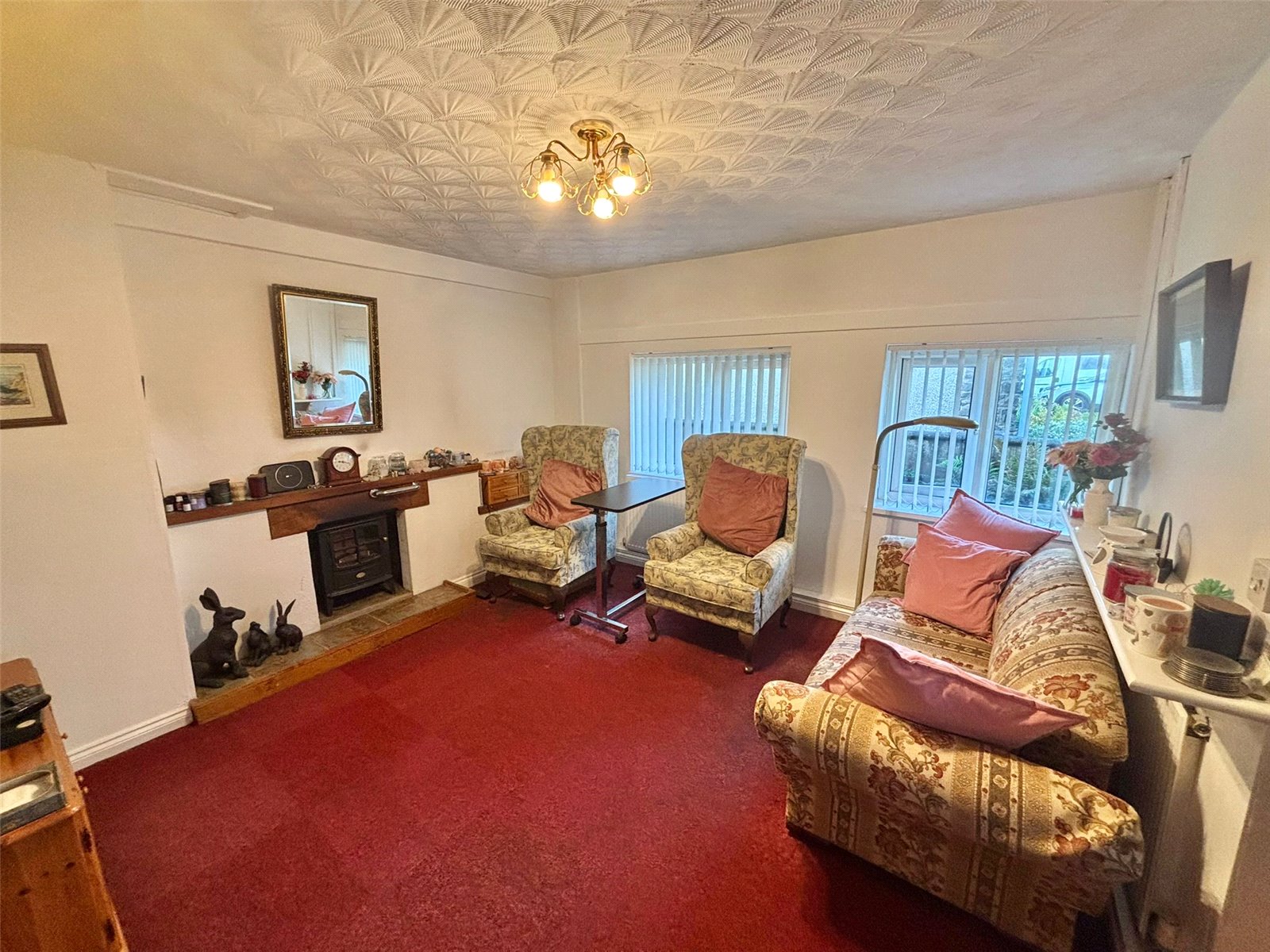 This warm and inviting living room is the perfect space for relaxation and entertaining. The room's focal point is a charming fireplace with a cast-iron stove, creating a cozy atmosphere perfect for chilly evenings. The vibrant, deep red carpet adds a touch of warmth and luxury, while a large window ensures the room is filled with natural light.