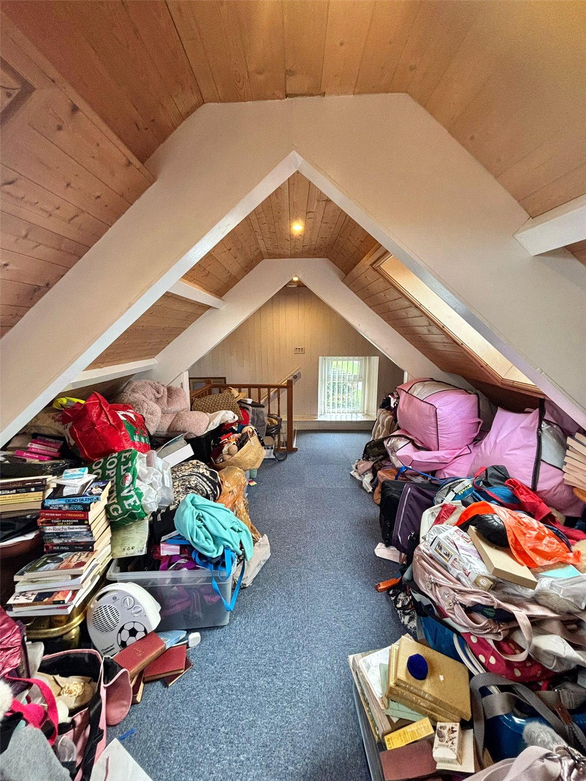 This property features a unique loft space with a vaulted, wood-paneled ceiling and exposed beams, creating a sense of rustic charm. The room is carpeted in a neutral blue, and a low door and small window at one end provide natural light and access.