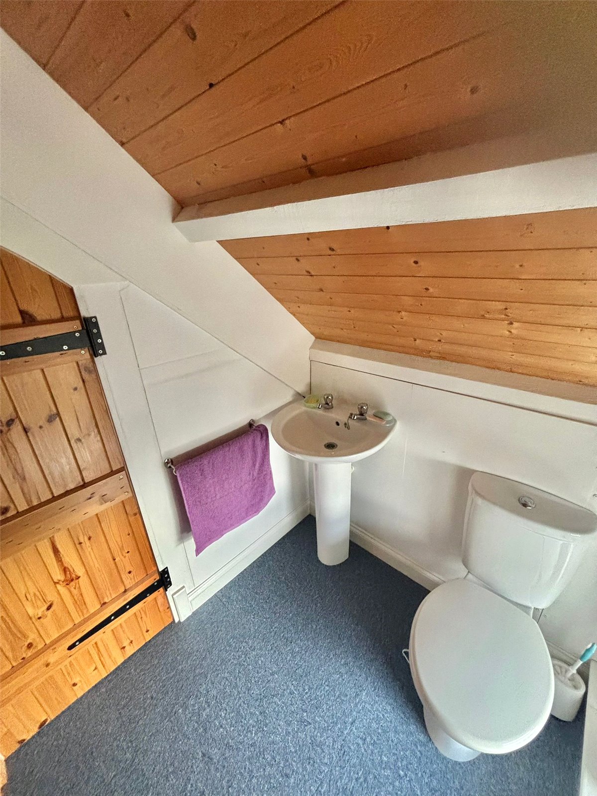 This cozy toilet room, tucked into the eaves of the property, features a standard pedestal sink and toilet. The space is distinguished by its sloped, timber-clad ceiling and a charming, rustic-style door.
