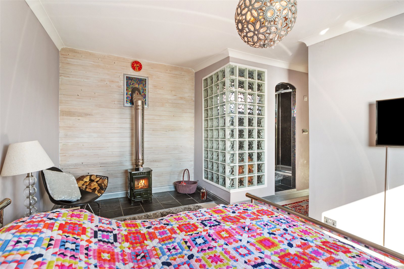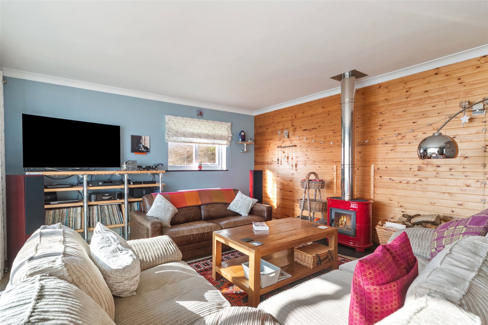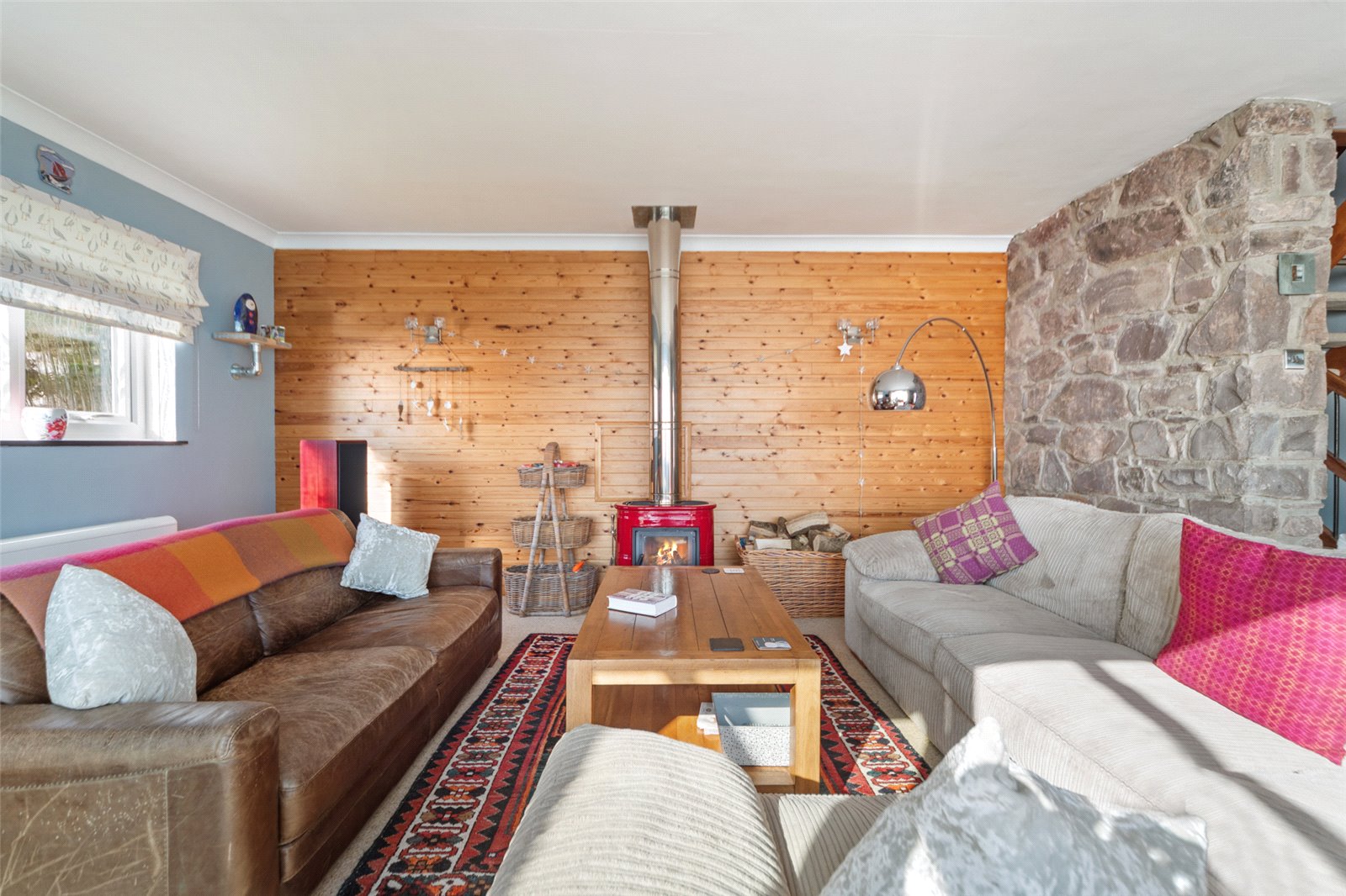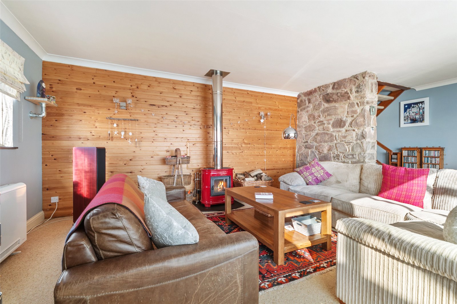 The property boasts a bright and inviting interior, with spacious rooms and stylish finishes throughout, creating a comfortable and homely atmosphere. The Front door opens into a welcoming Porch area with a lovely feature stained glass window a boot and shoe room to the side which is a great space for storage of shoes and coats. There is a further door leading into the Hallway which boasts a lovely feature stone wall alongside the staircase and access doors leading directly off to the Utility Area with space and plumbing for appliances and also the Family Bathroom. To the far end of the Hallway you will find the spacious Kitchen / Diner which offers a great range of base units with space for freestanding appliances. There is plenty of space for a dining table and chairs with French doors leading out onto the Patio area which is perfect for al fresco dining come summer time. There is also a fitted Range cooker with an overhead cooker hood which will remain with the sale of the property. The Lounge area face to the front of the house and has a beautiful red Italian ceramic log burner which heats this large space. There are sliding doors leading into the Sun Room which is the most wonderful location to sit out and enjoy the views all year round. This area is another great space for entertaining, relaxing or even working from home and has a door which leads out onto the elevated patio area. To the far end of the Lounge you will find a further reception area which also leads onto the Sun Room. This versatile area could be utilised for a home study / library or possibly even a 4th Bedroom if further sleeping space was required. The first floor landing has further feature stained glass windows and provides access into all 3 Bedrooms which all enjoy front facing aspects overlooking the view. They boast built in storage cupboards and the Master Suite also features it’s own En Suite Shower Room and its very own log burner. The property benefits from double glazed windows and doors throughout and the heating is electric. The roof was renewed in 2022 and is slightly on an angle facing to the south so would be an ideal location to install solar panels which would reduce the living cost.