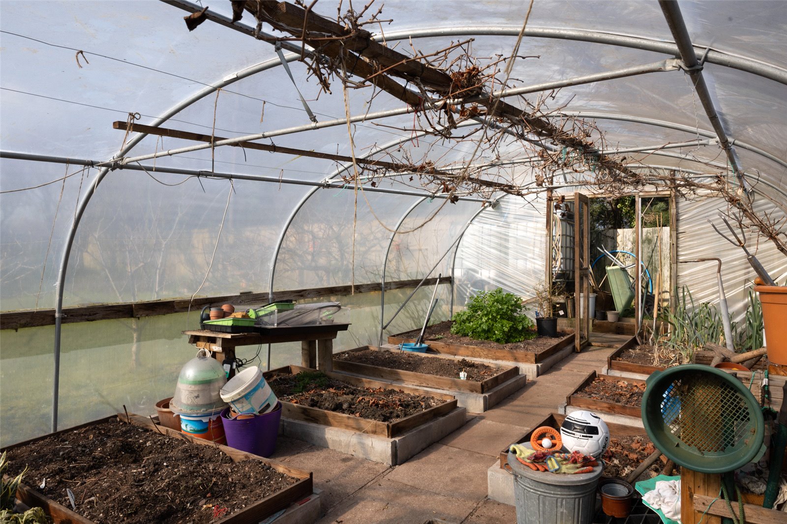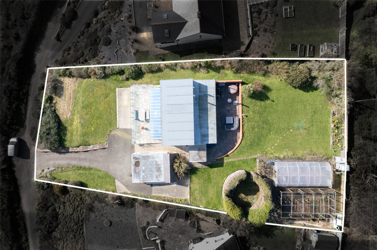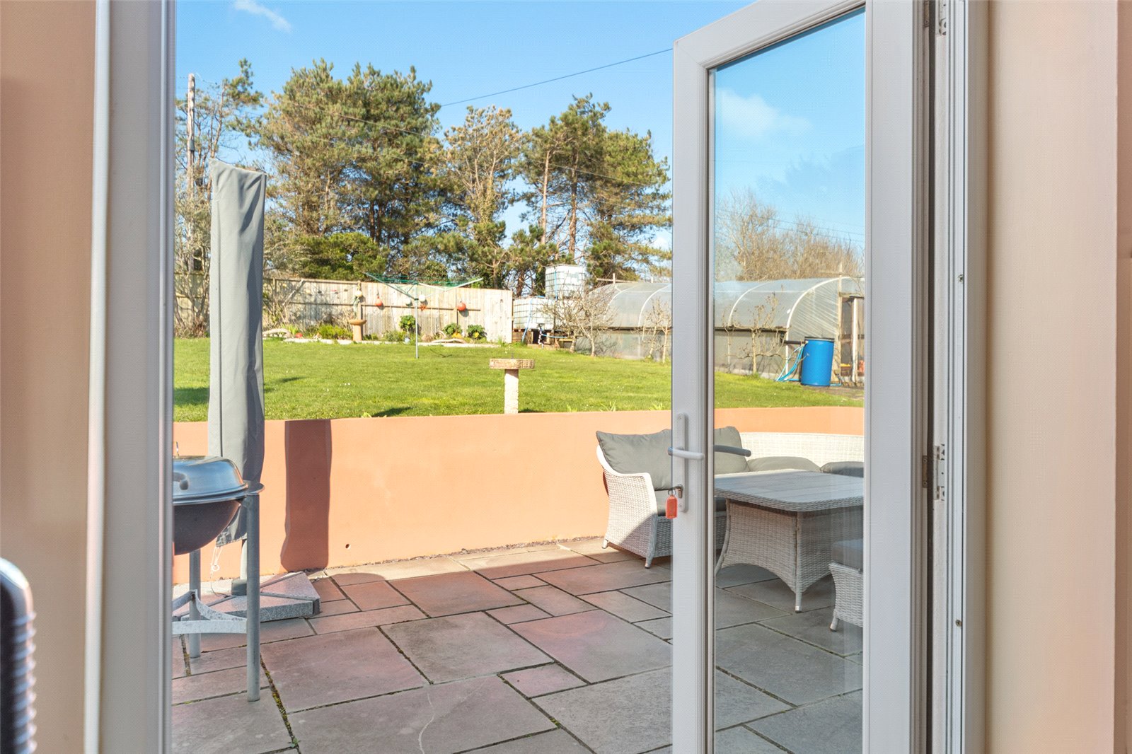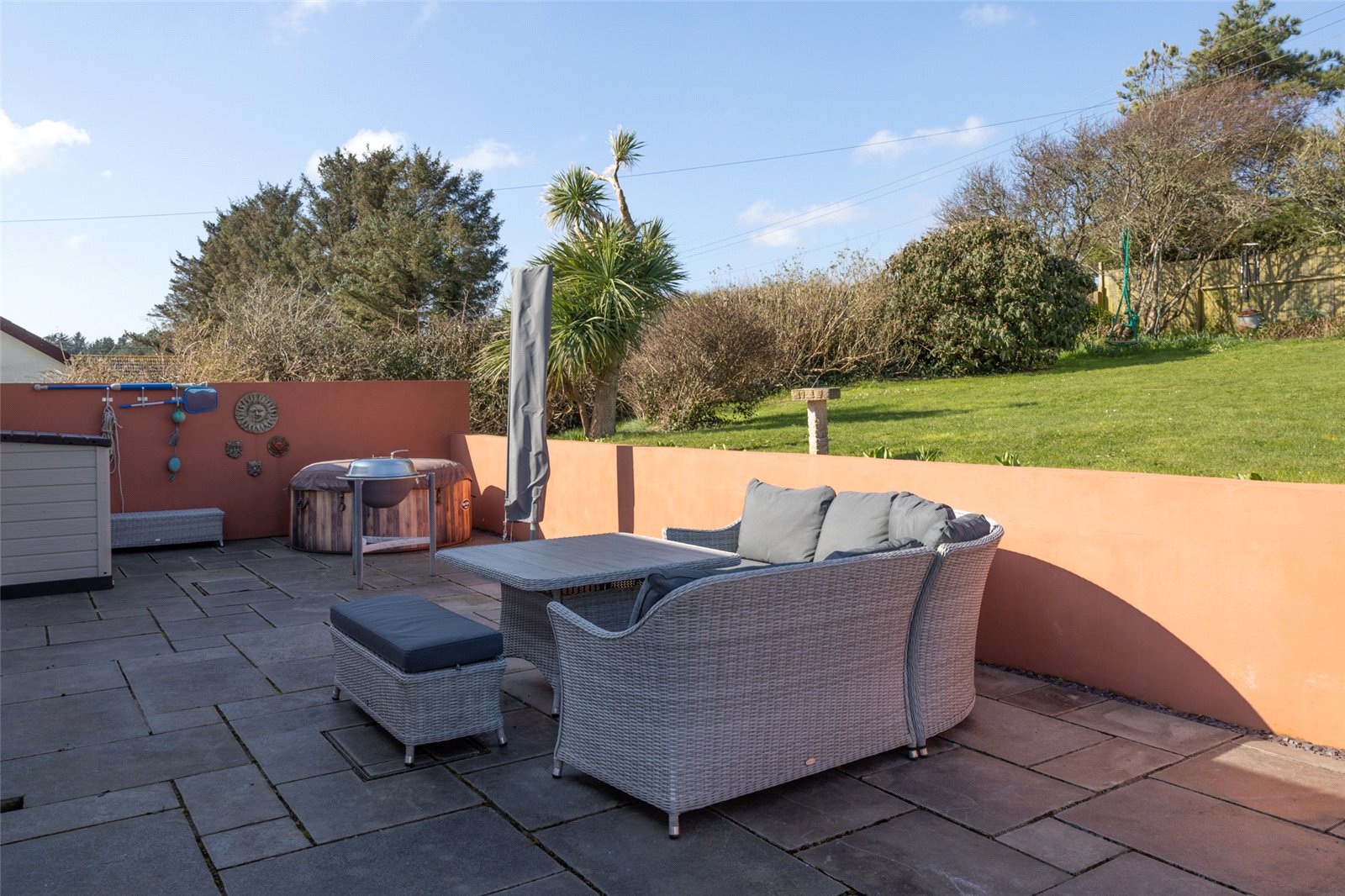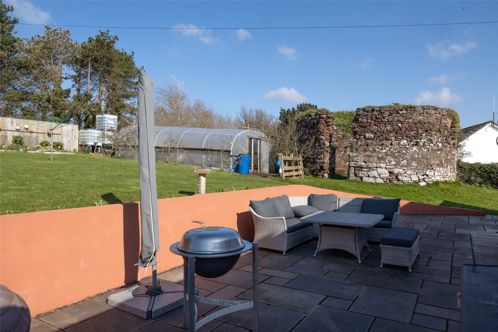 Externally to the front the property has a large driveway which opens up onto parking spaces and also access into the Garage. Alongside the driveway are steps which are next to the front grassed Gardens. To the rear of the Garage is a unique woodstore with slated roof keeping the logs dry and accessible throughout the winter months. The lovely raised glass Balcony runs along the front of the property and there are 2 side access’ to the rear of the property. Here you will find a further patio area and also a further large lawned Garden. There is also an historic mill which remains in the grounds and just behind is the Polytunnel which is brimming with fresh fruit and veg throughout the summer months.