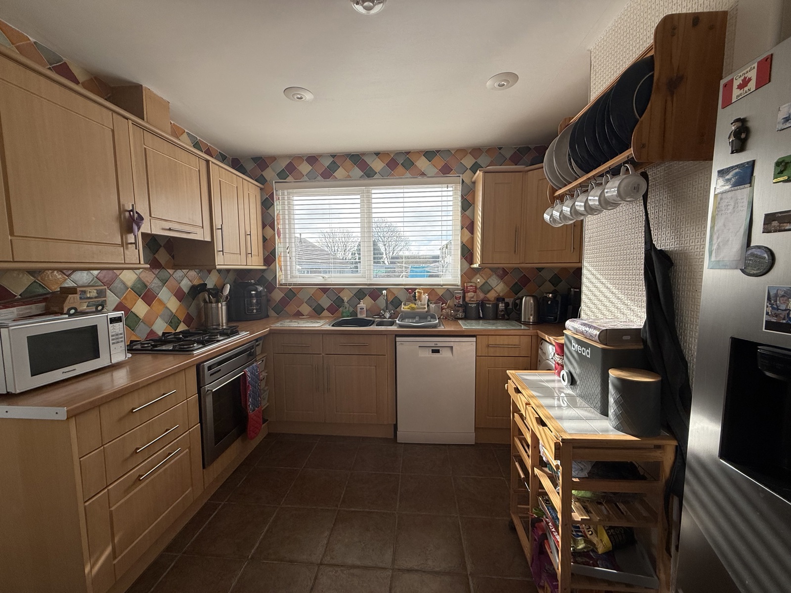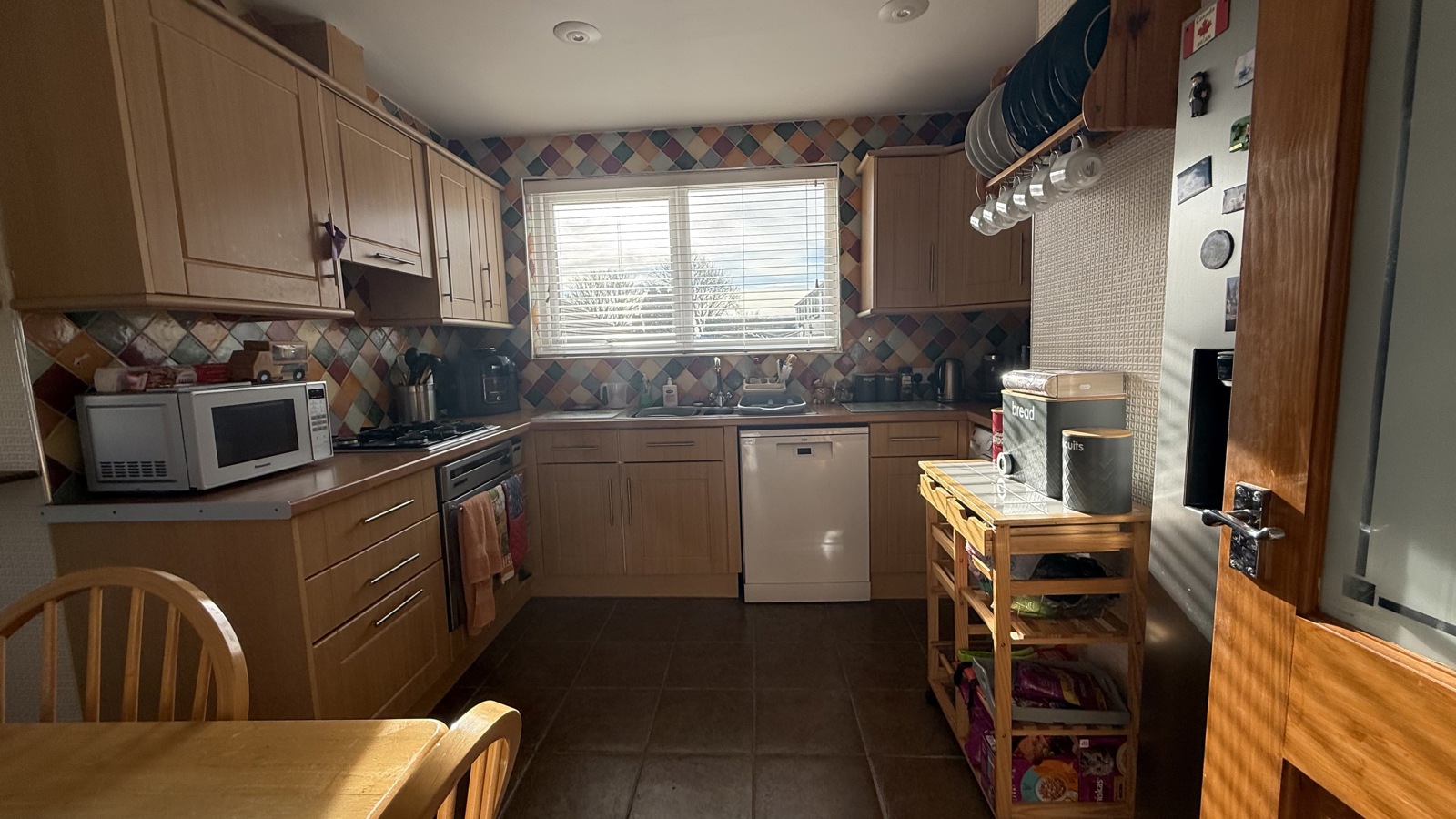 Well-presented kitchen with a practical layout and excellent natural light from a large rear window. Finished with warm wooden cabinetry and vibrant tiled splashbacks, the space includes integrated appliances and ample worktop area. A dedicated dining nook adds versatility, making this a functional and inviting hub for everyday living.