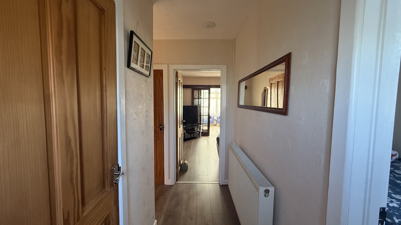Warm and welcoming living room with a well-balanced layout and excellent natural light. Finished in soft neutral tones with laminate flooring, the space feels both stylish and homely. Features a central fireplace with decorative mantel and mirror, creating a natural focal point. Ideal for relaxing or entertaining, this is a comfortable and inviting everyday living space.